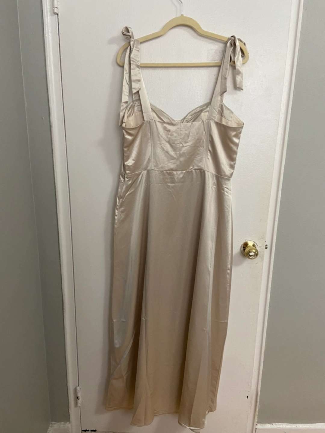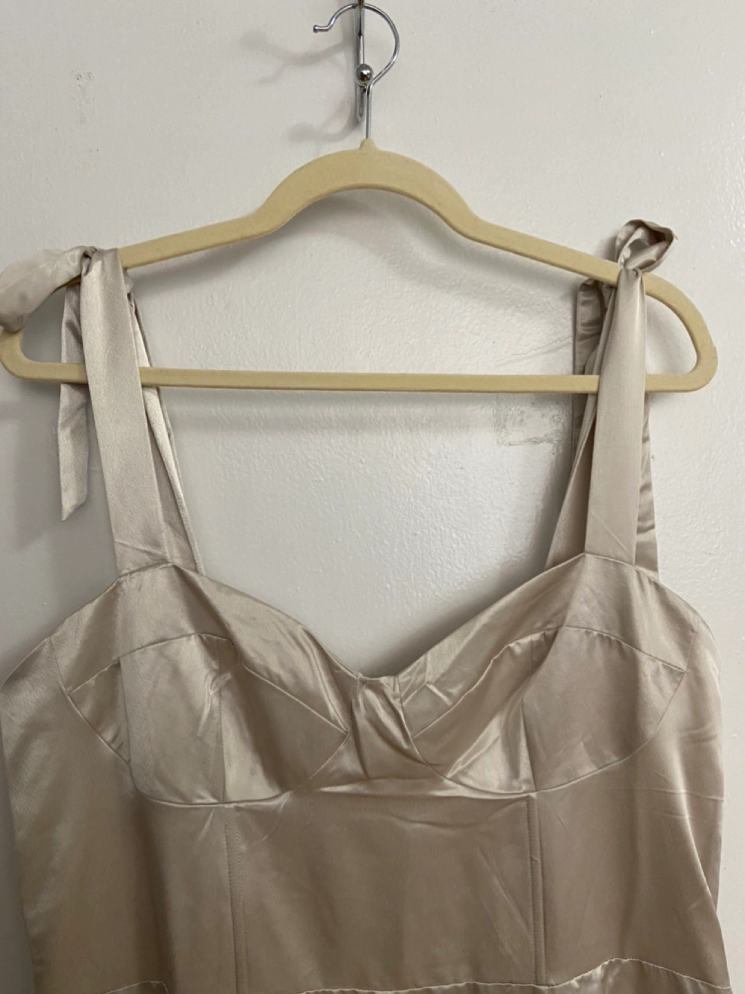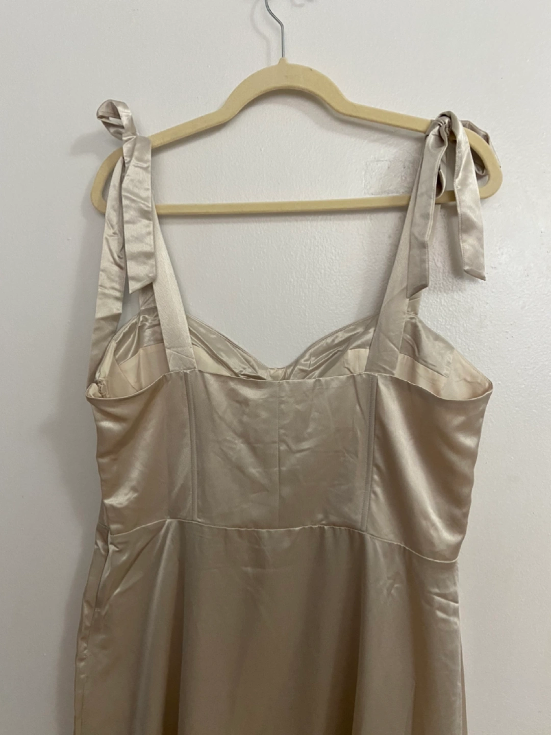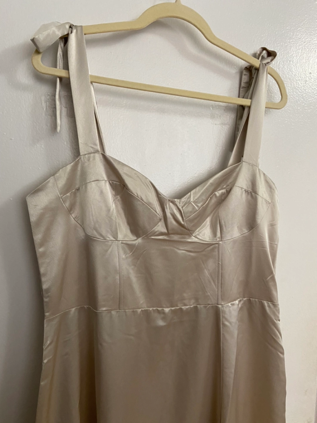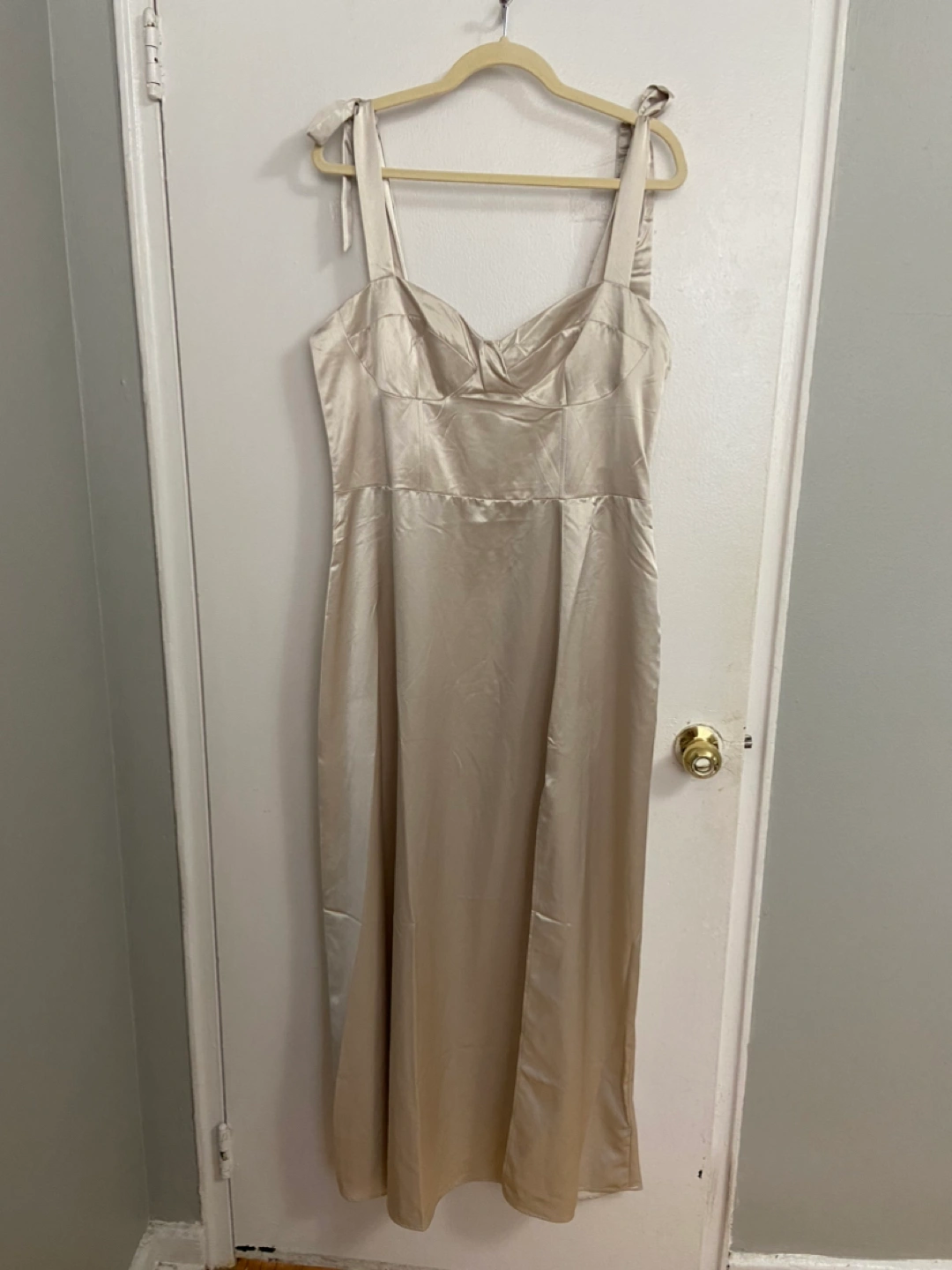 Size large H&M dress in a beige colour. Never been worn, tags on. Bought it as an option and didn’t end up wearing it. Would love to see it see another life instead of hiding in my closet. This would be great for Prom or a wedding guest dress!