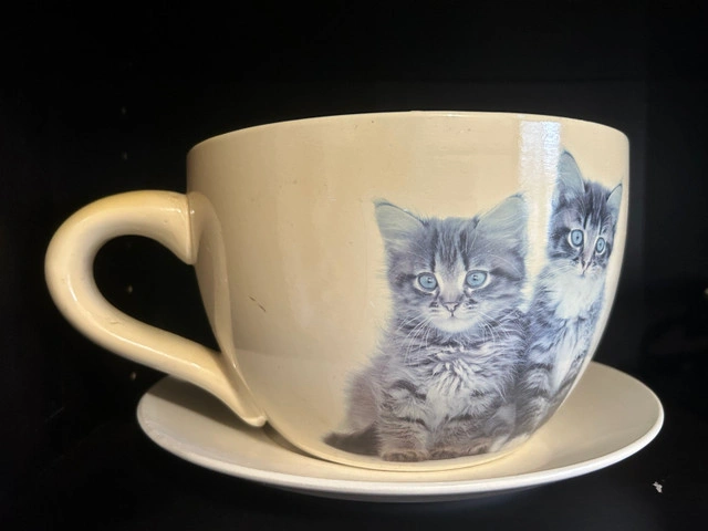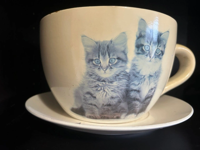 Add a touch of cuteness to your plant display with this Large Ceramic Novelty Planter featuring adorable kittens. The glazed white finish of the ceramic material gives it a modern look that will fit perfectly in any home decor. This planter is perfect for holding larger plants and adding a playful touch to your space. The quality ceramic material ensures that it is durable and long-lasting. A couple of small chips but otherwise in good condition.