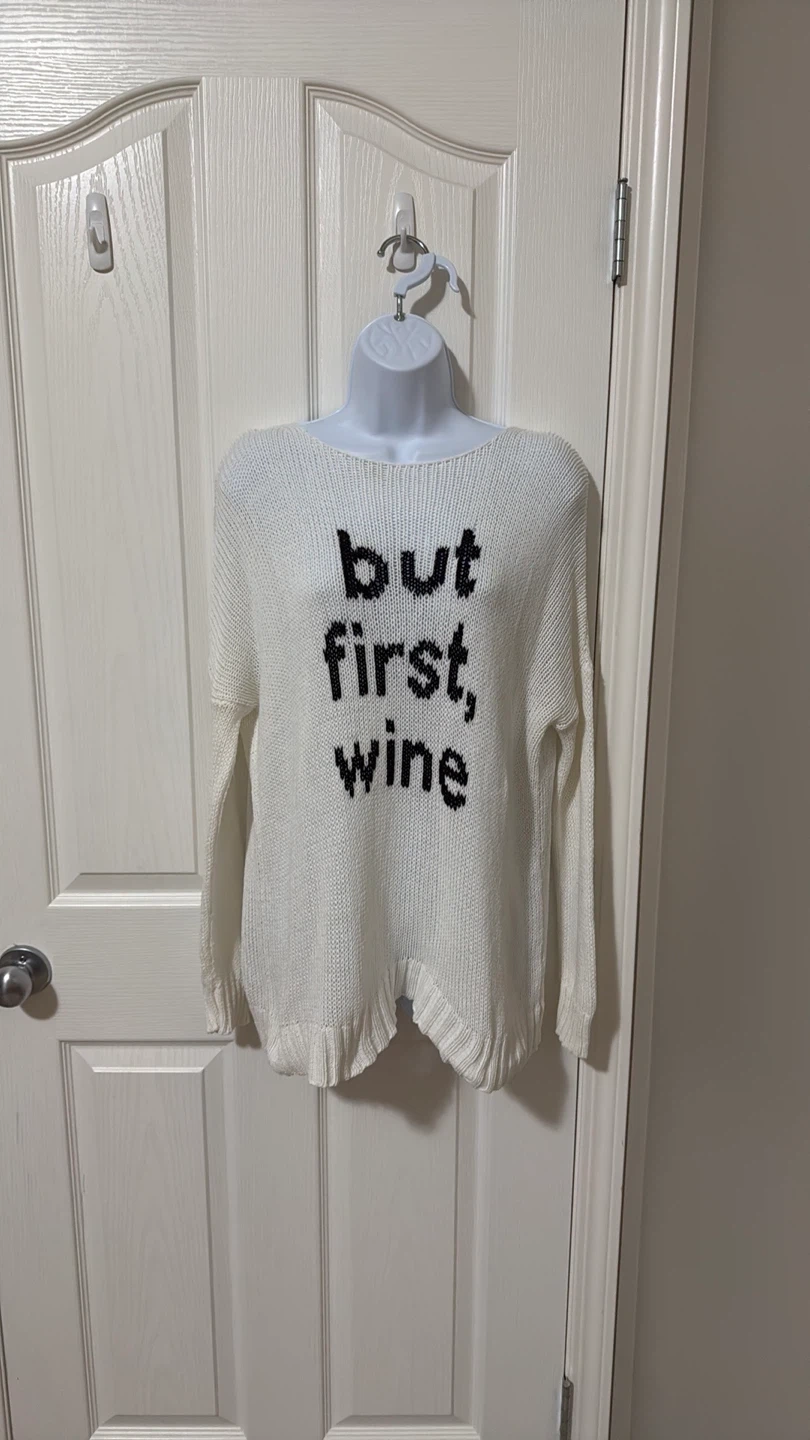 Wooden ships sweater “but first wine”