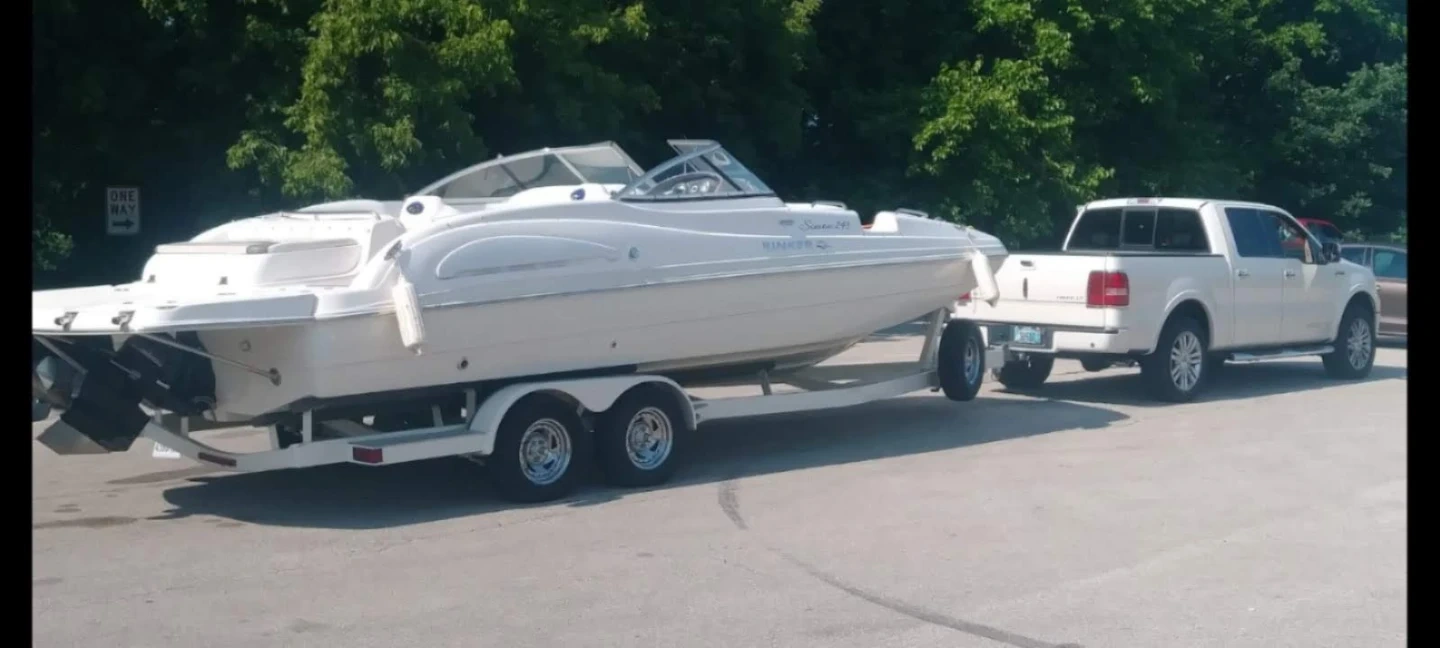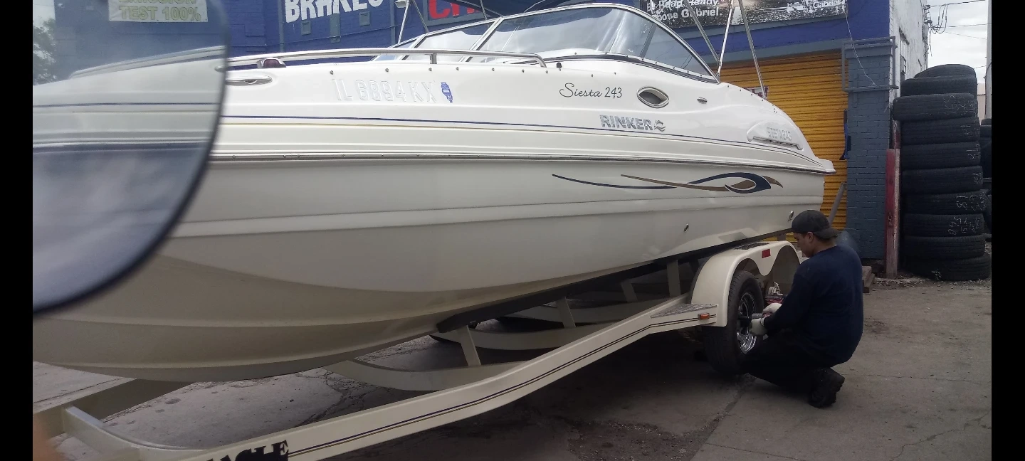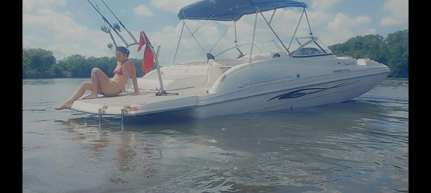This Rinker Siesta 243 offers a spacious deck with a gray teak swim platform. It's a great boat for enjoying time on the water with friends and family. The platform provides easy access in and out of the water.