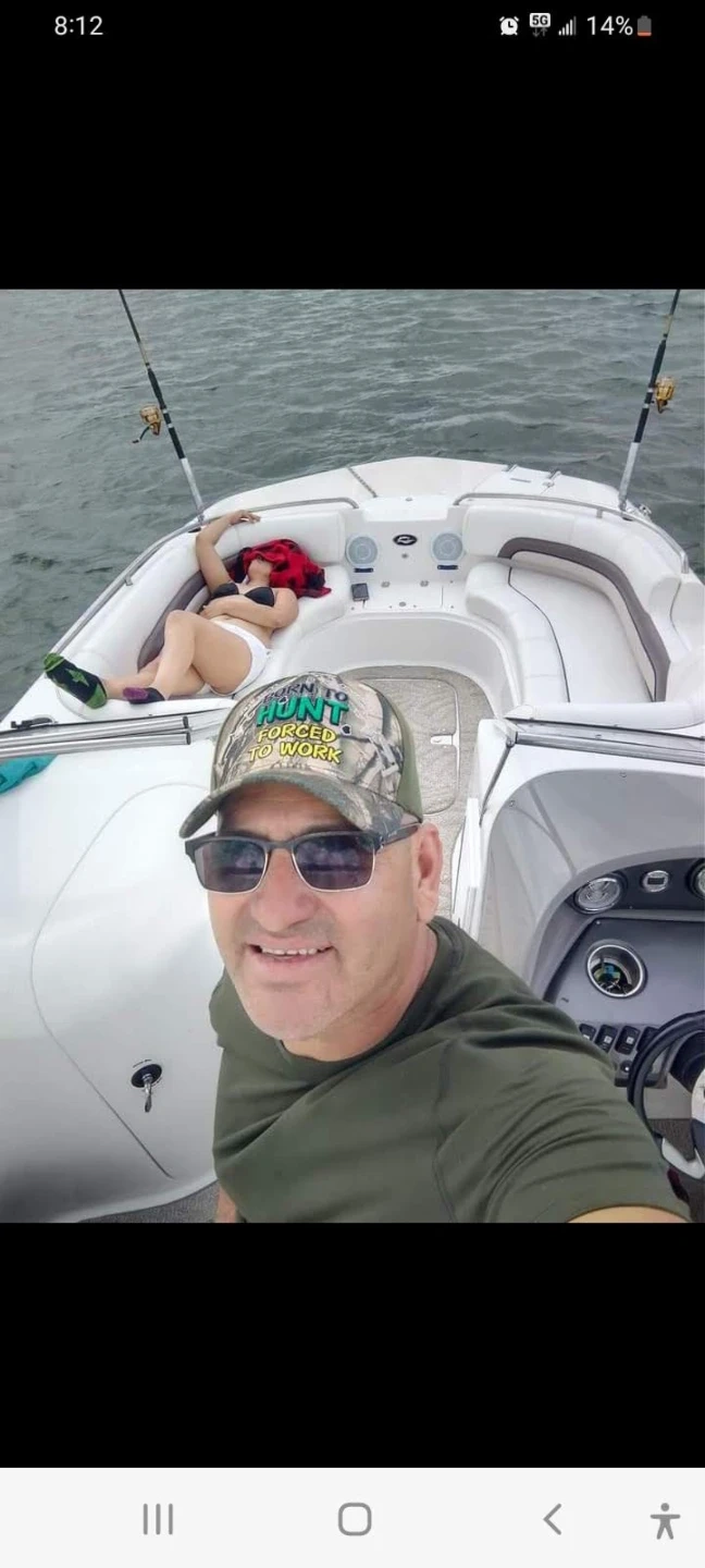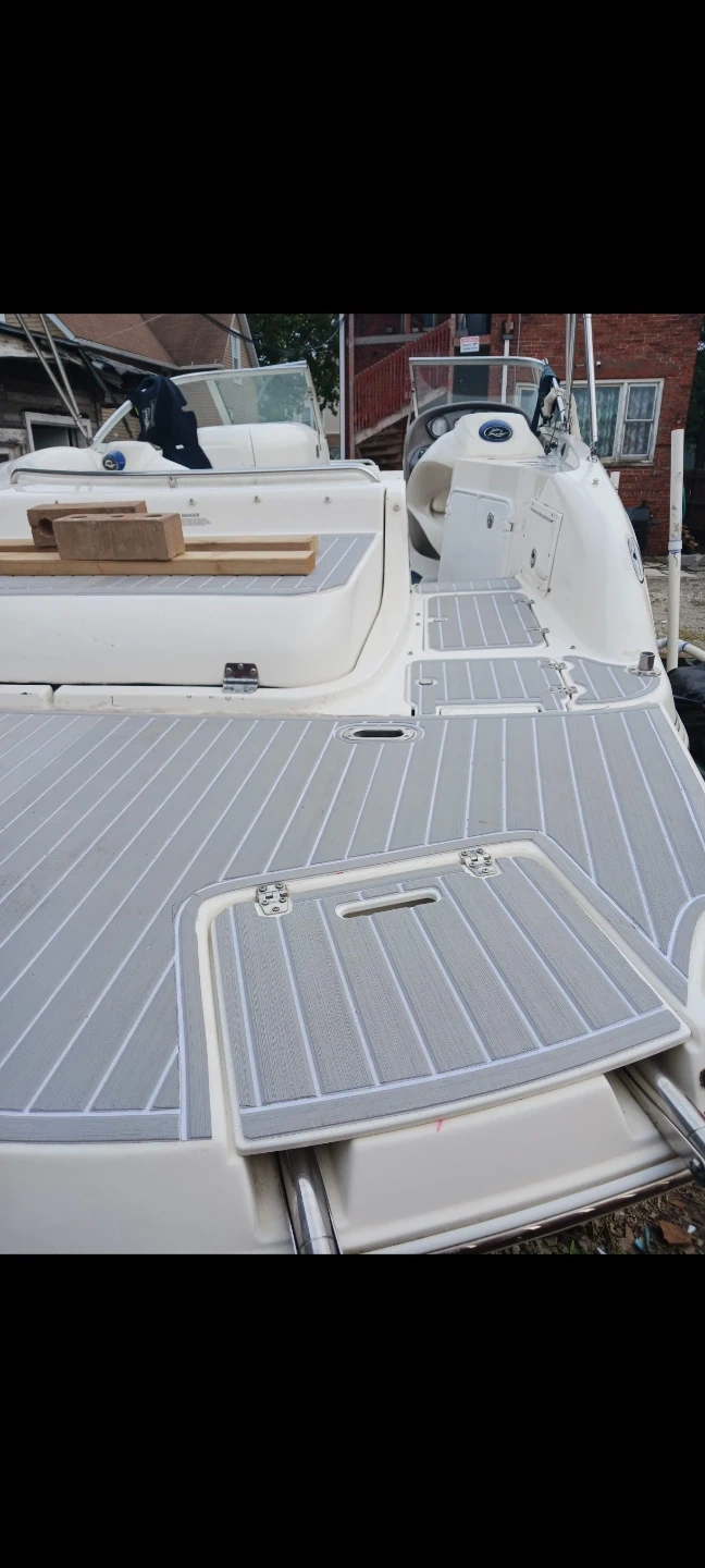 This Rinker Siesta 243 offers a spacious deck with a gray teak swim platform. It's a great boat for enjoying time on the water with friends and family. The platform provides easy access in and out of the water.