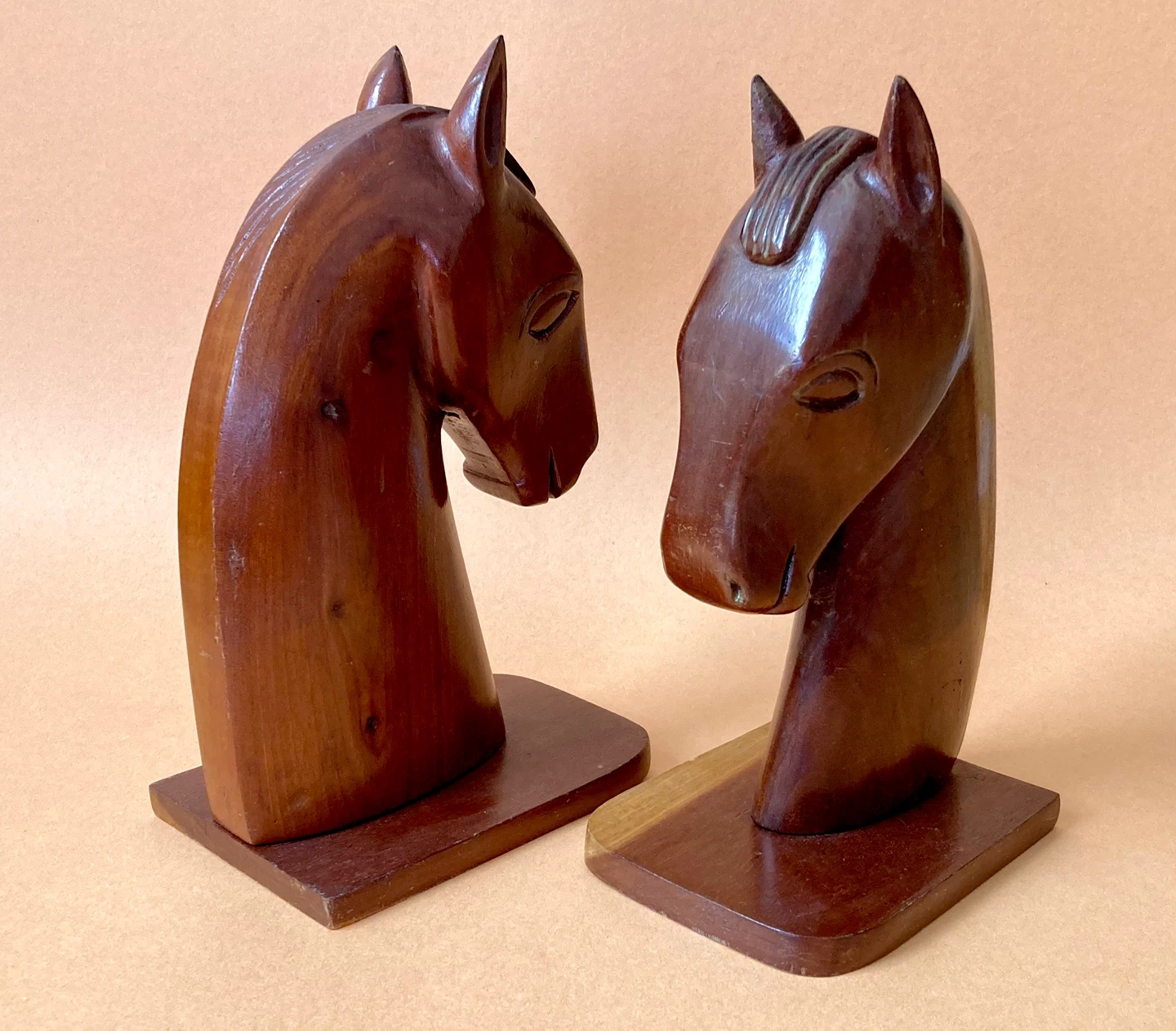 Hand carved wooden horse head bookends. They each have a sticker on one side indicating they are from the Dominican Republic. You could feature them on that side or the alternate side, which has no sticker. They would add a touch of warmth and whimsy to any space. They have minor signs of age, but otherwise great vintage condition. About 9 1/2 inches tall. Pick up in the Ossington and Davenport area. Check out my other listings for more vintage home decor π