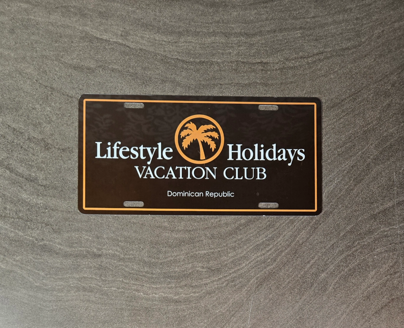 License plate from Lifestyle Holidays Vacation Club in the Dominican Republic. It's in new condition, never put on a car was used as decor. Fun addition for anyone who is a member of the vacation club. Brown in color and is metal. Cross-posted.