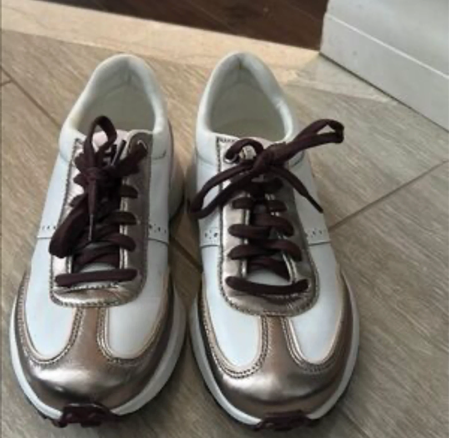 84These Cole Haan sneakers are in a lovely white and rose gold colour combination. They would be a great addition to your style. Leather, suede, and textile mesh upper in White with accents in Rose Gold Feel free to also check my other listings make a bundle with discount.