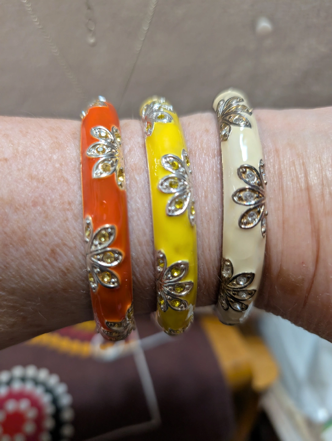Selling a cute necklace, earrings and bracelet in cream enamel-like colour! Also included is orange and yellow bracelets with the same lovely floral design. Bracelets are spring opening/closing. Metal. Perfect for adding a pop of colour to any outfit! All in great condition. Lot #2