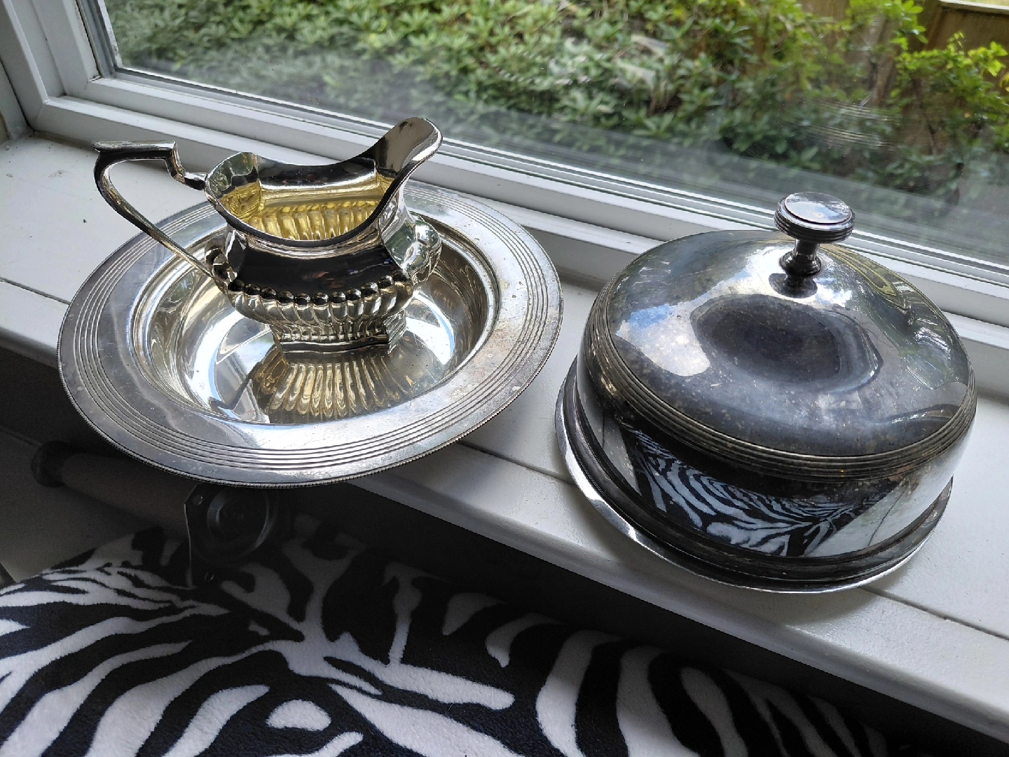 FREE! vintage silver plated creamer with a matching plate and dome. They are in good condition and would be a lovely addition to any table setting!