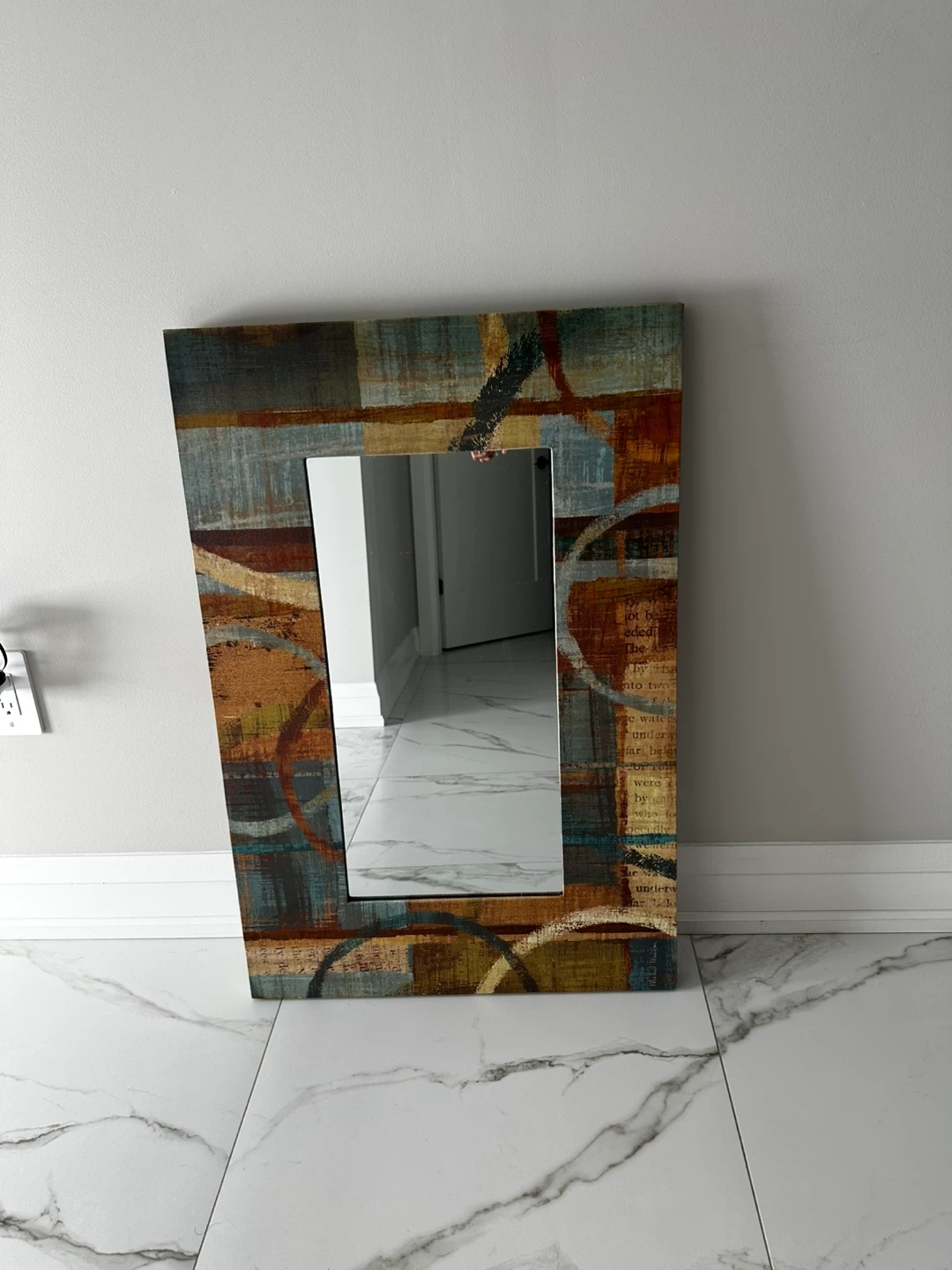 Decorative wall mirror with a unique design. It's in great condition and ready to add some style to your home. The frame features a mix of colours and patterns, making it a standout piece