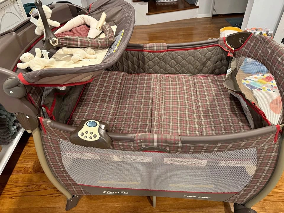 This Graco Pack 'n Play has been a reliable spot for naps and playtime. It's in great condition including the bassinet and mobile. The plaid design is classic and fits well in any room. It's easy to set up and fold down, making it perfect for travel or moving around the house. This item originally had the bassinet attachment, but on the right side, the bar is missing. You can find it on eBay or on the Graco accessory. Changing table also included. Please look at the picture and ask any questions!
