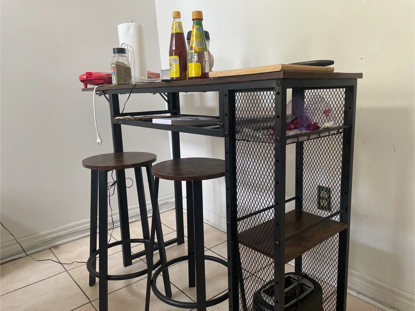 Selling a bar table with foldable edge and two stools. It's a great set for a smaller space or to add a casual dining area to your home. The table has a dark wood top and a black metal frame, with some shelving for storage. The stools match the table with dark wood seats and black metal legs. Perfect for enjoying a quick meal or drinks with friends.