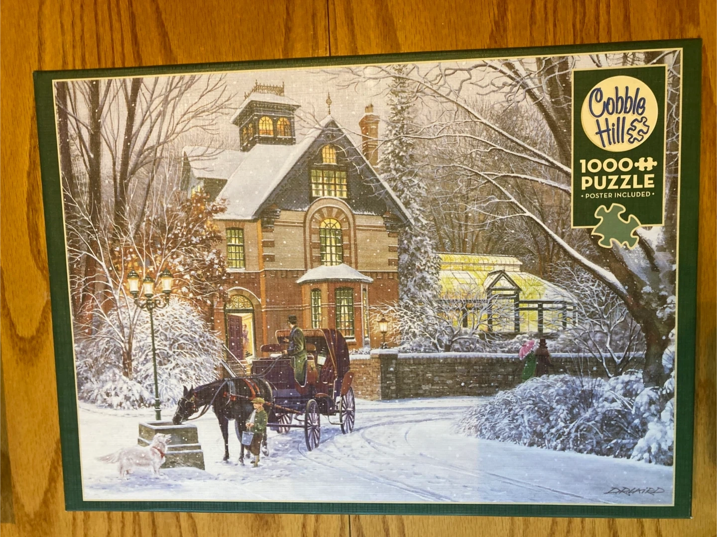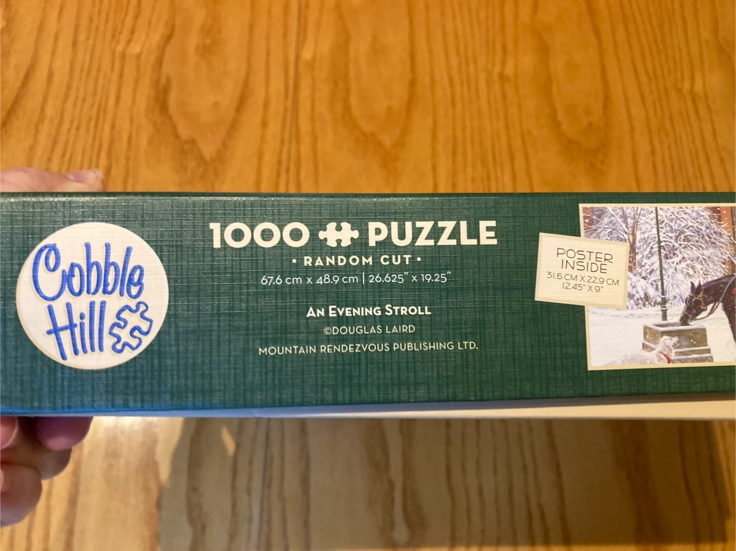 Looking to sell a Cobble Hill 1000 piece puzzle titled "An Evening Stroll"! It features a random cut and includes a poster inside. The puzzle measures 67.6 cm x 48.9 cm (26.625" x 19.25") and the poster is 31.6 cm x 22.9 cm (12.45" x 9").