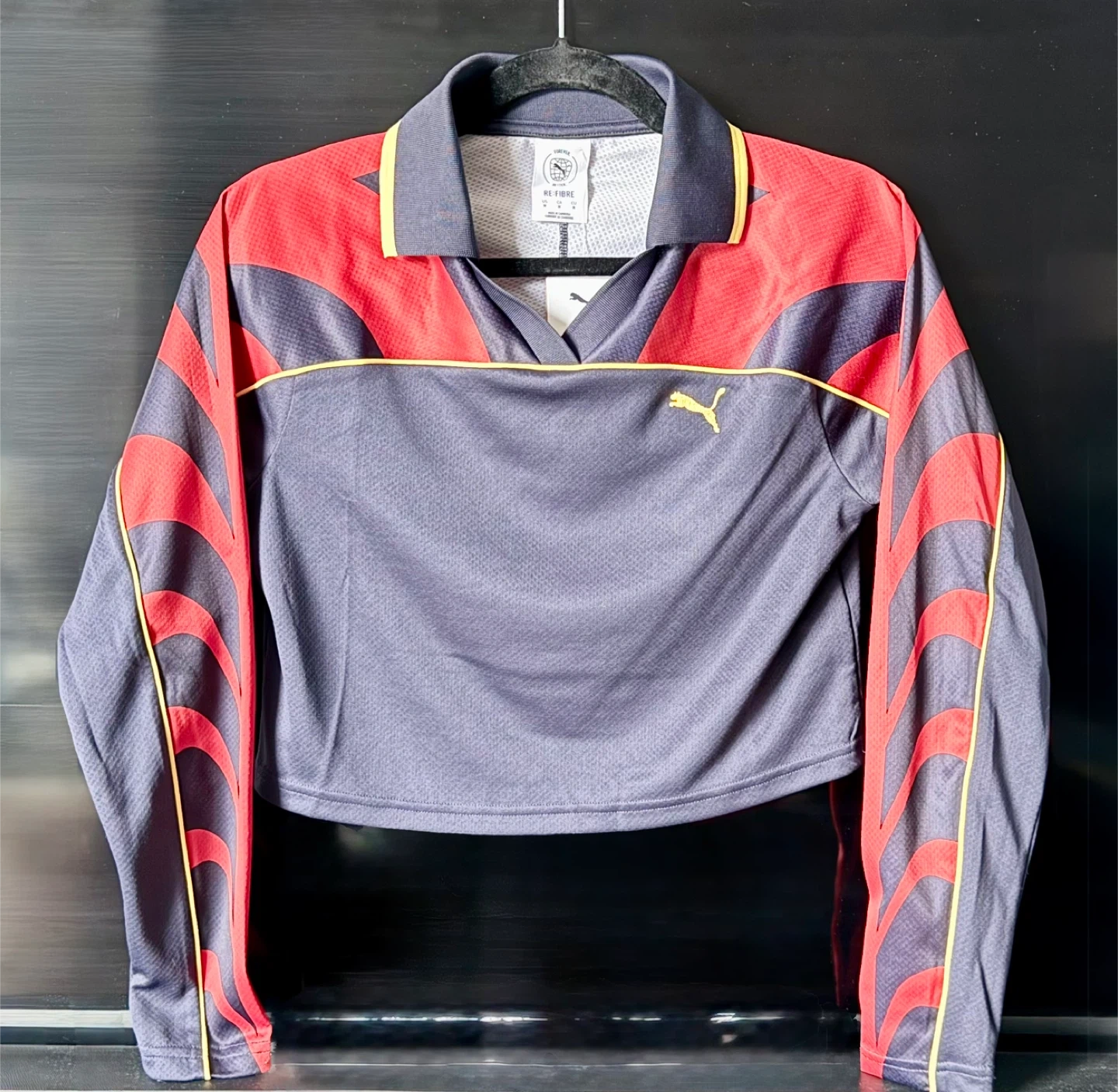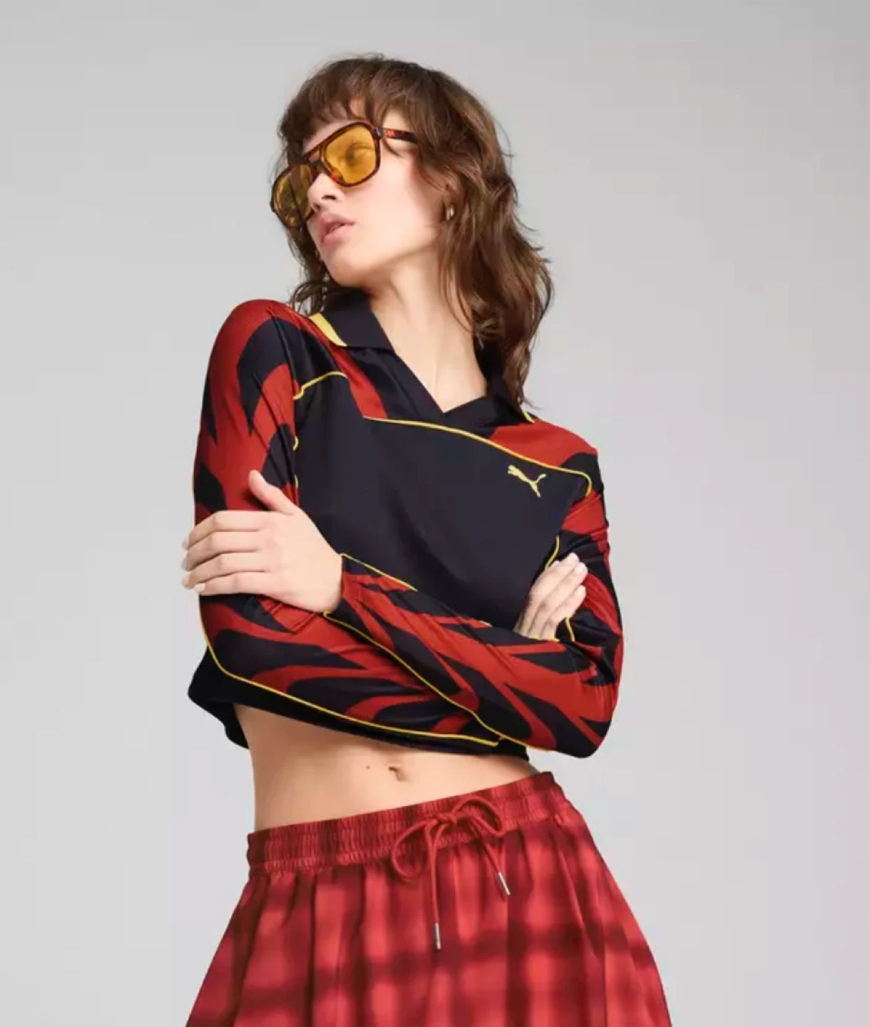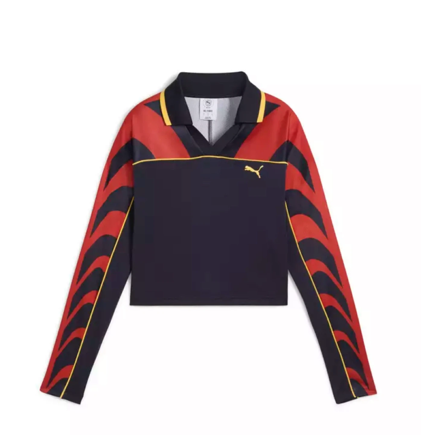 This Puma ROAD TO UNITY FOOTBALL BABY TEE UNISEX – Long sleeve crop top features a unique design with red and black accents and yellow piping. It's a stylish and sporty piece that's perfect for workouts or casual wear. The Puma logo is embroidered on the chest.