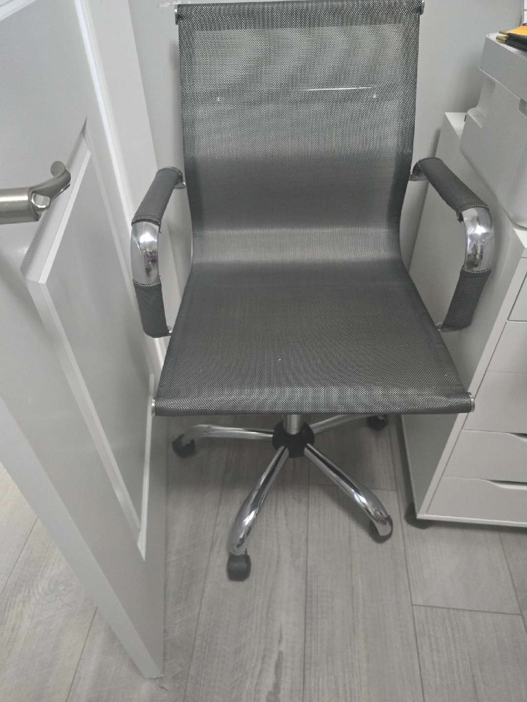 Selling a grey office chair. It's in good condition and ready for a new home! It has a mesh back and padded armrests for comfort. The chair also has a five-star base with wheels for easy movement around your workspace