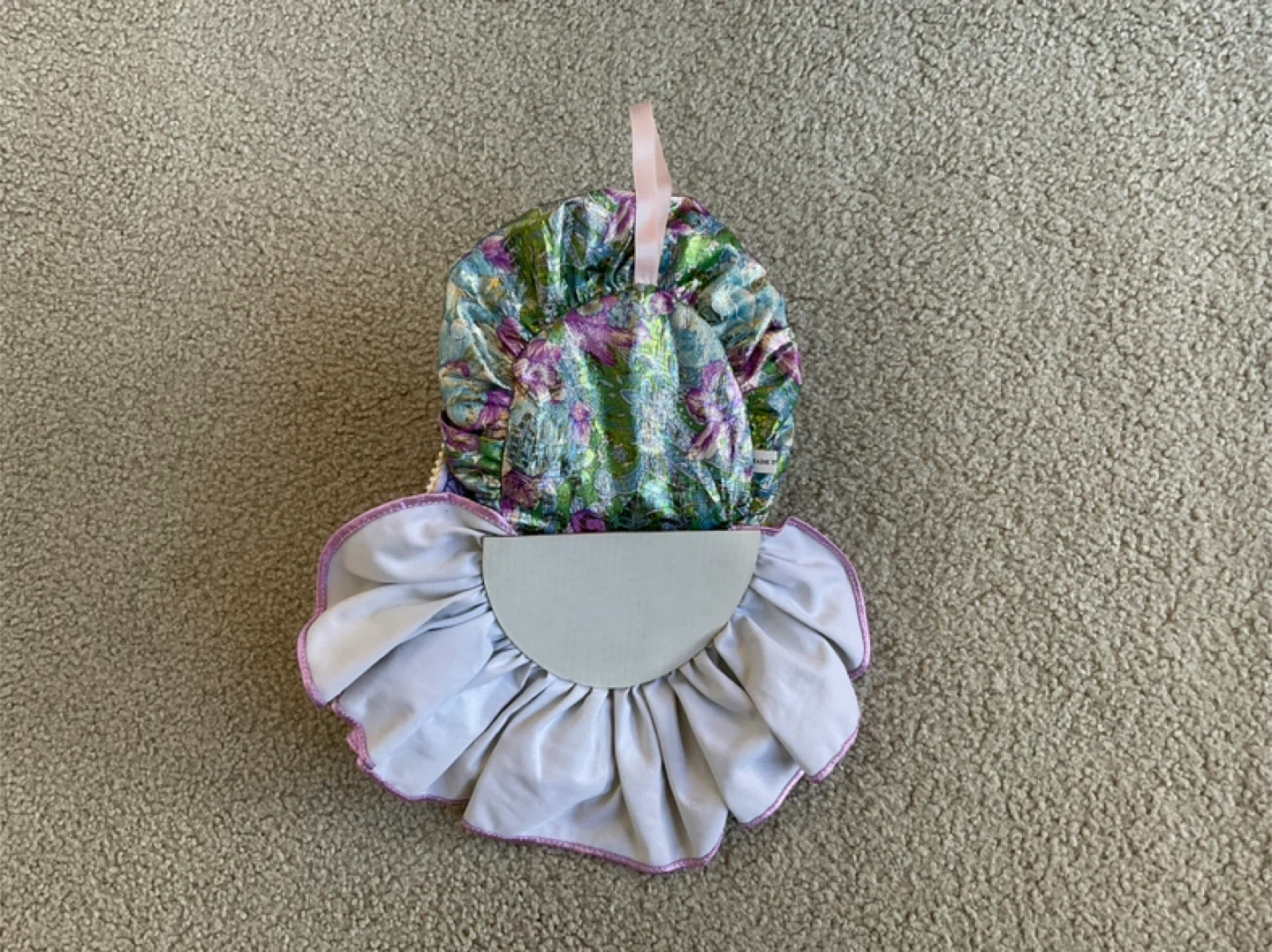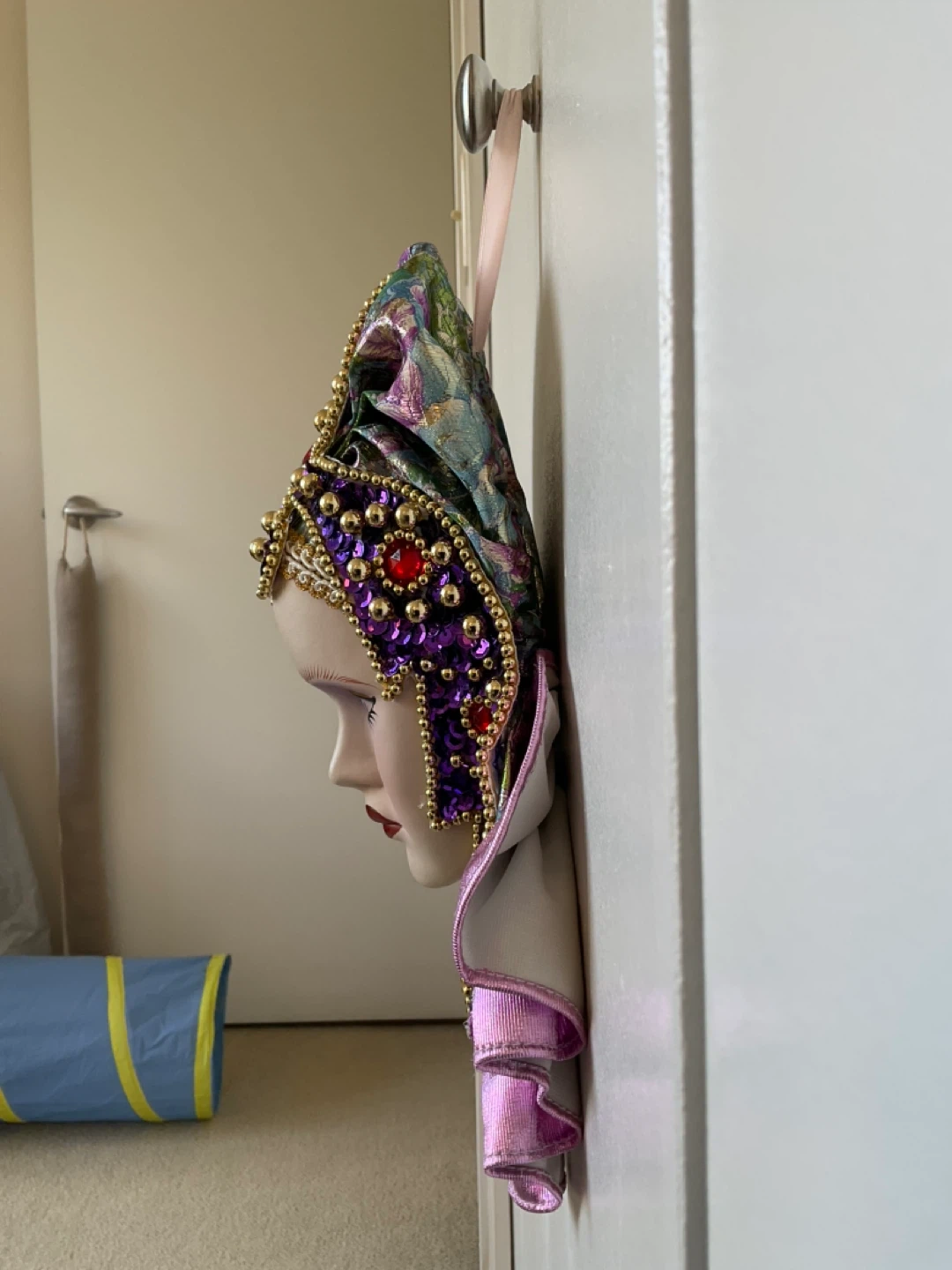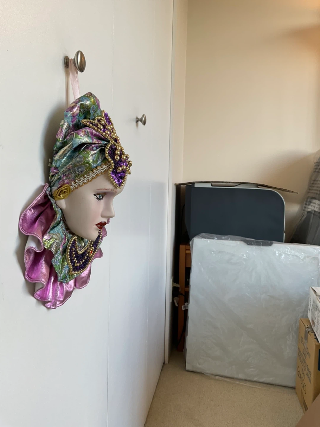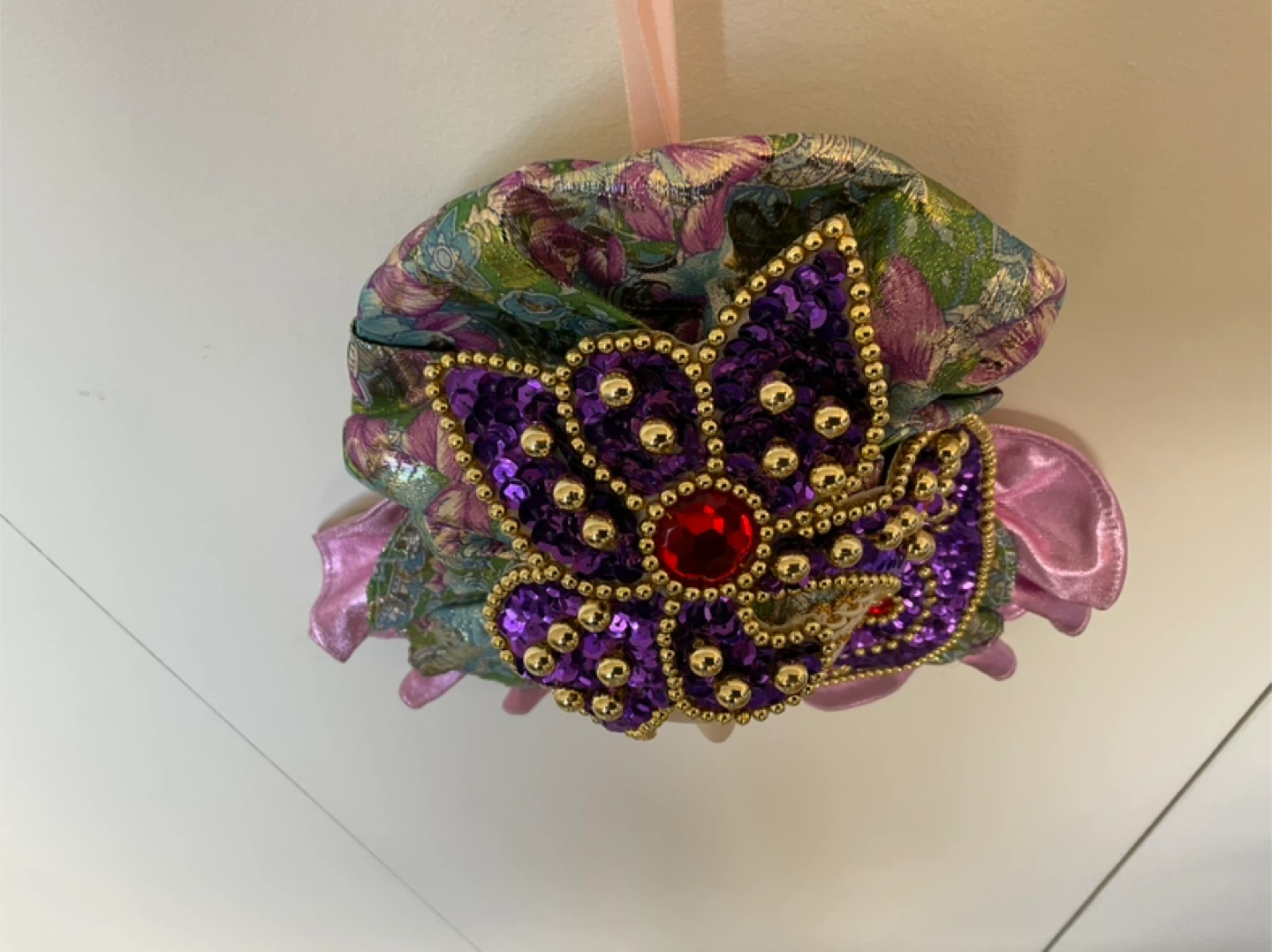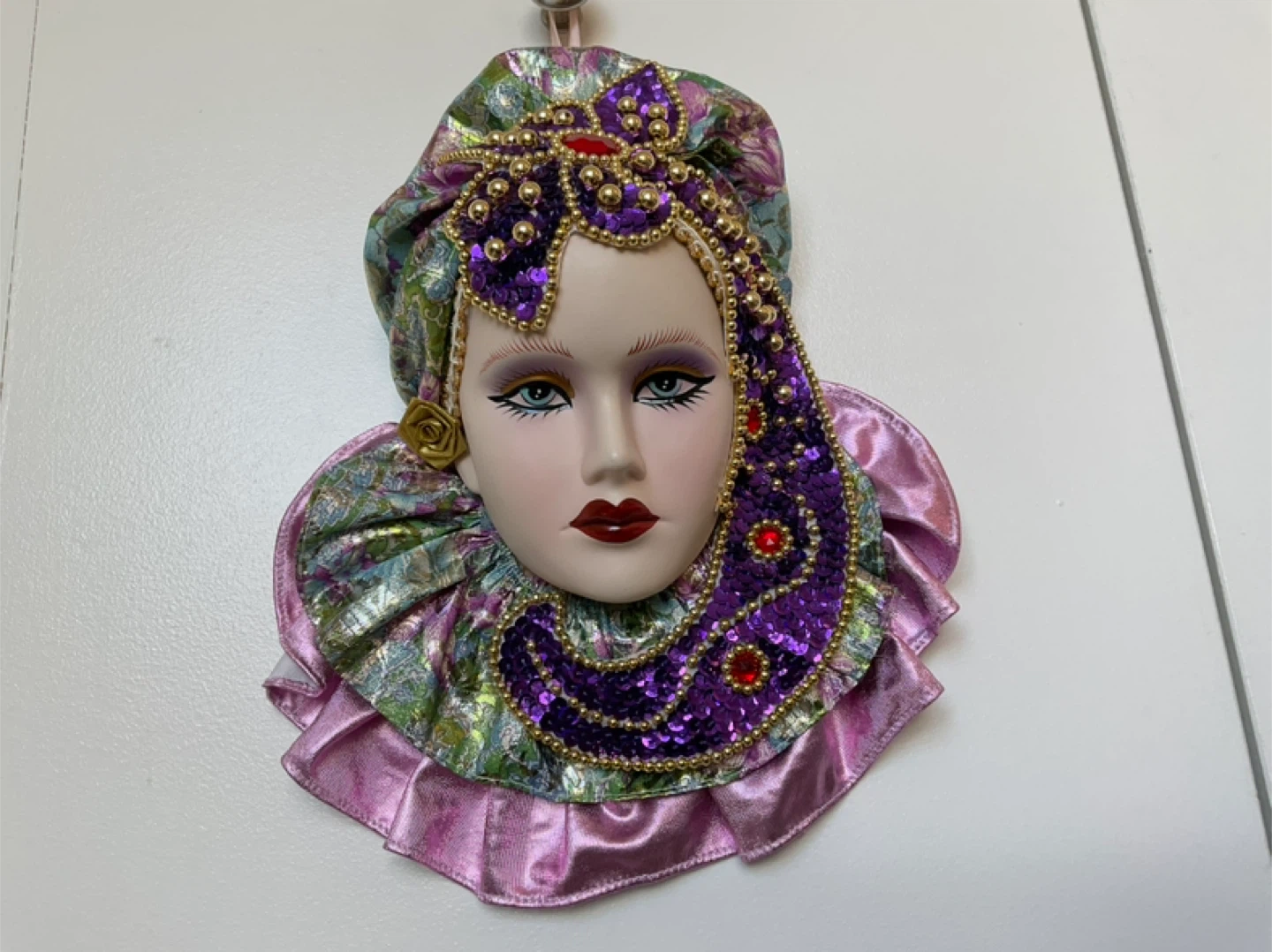 Decorative Mardi Gras mask measures 12” in length from top of hat to bottom layer, width measures 10” across bottom layer. Cash only. Marine Drive and Kerr area.