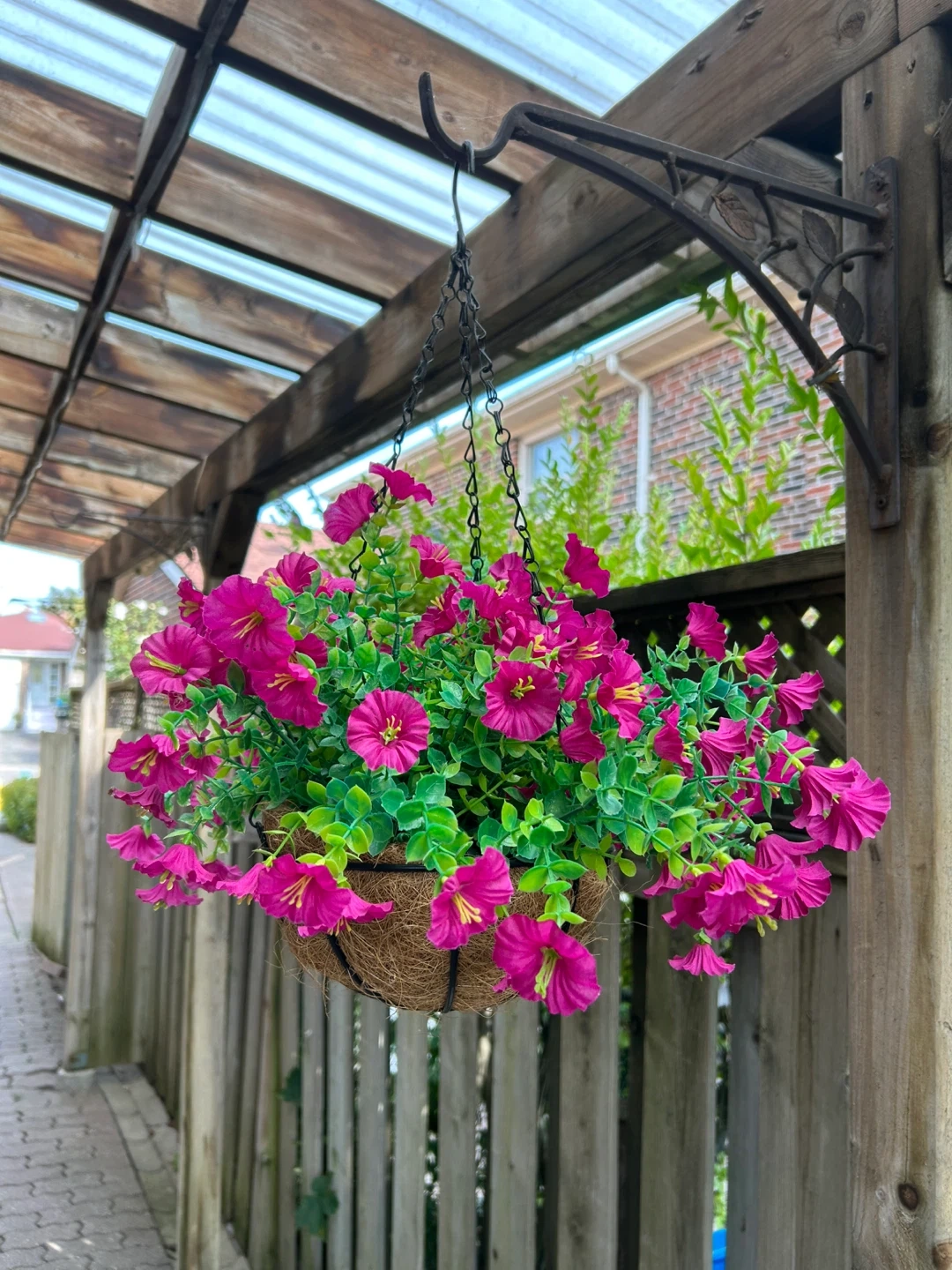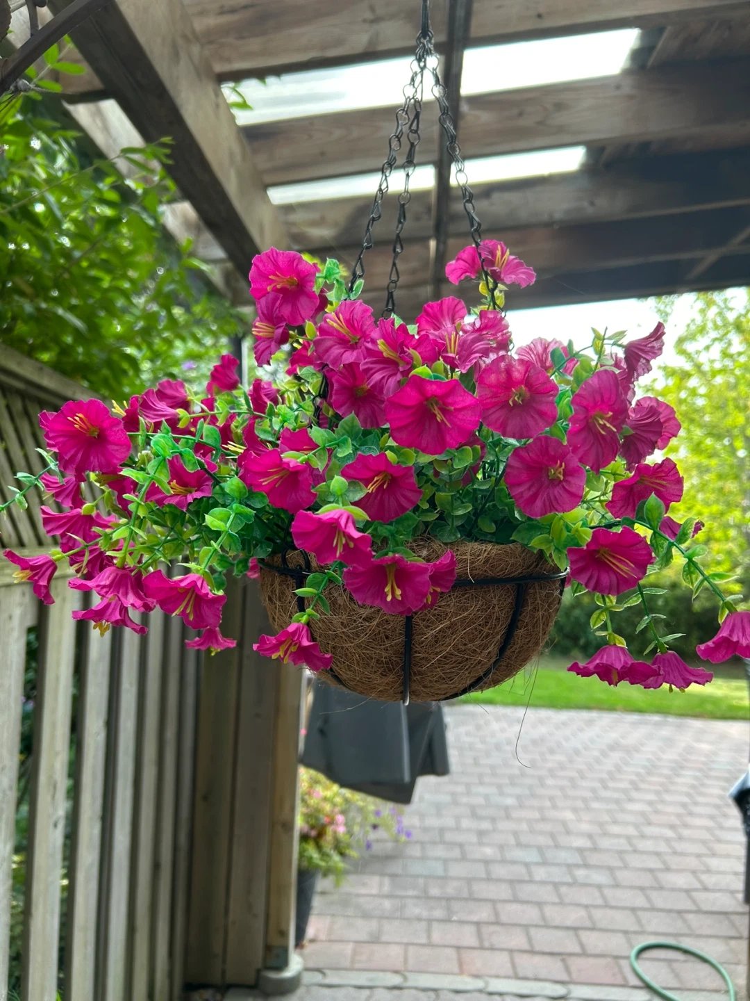 Spruce up your outdoor space with this lovely hanging basket! It features bright pink artificial flowers and lush greenery, perfect for adding a pop of colour to your patio, deck, or garden. The basket is made of a natural-looking fibre material and has a sturdy metal frame and chain for easy hanging