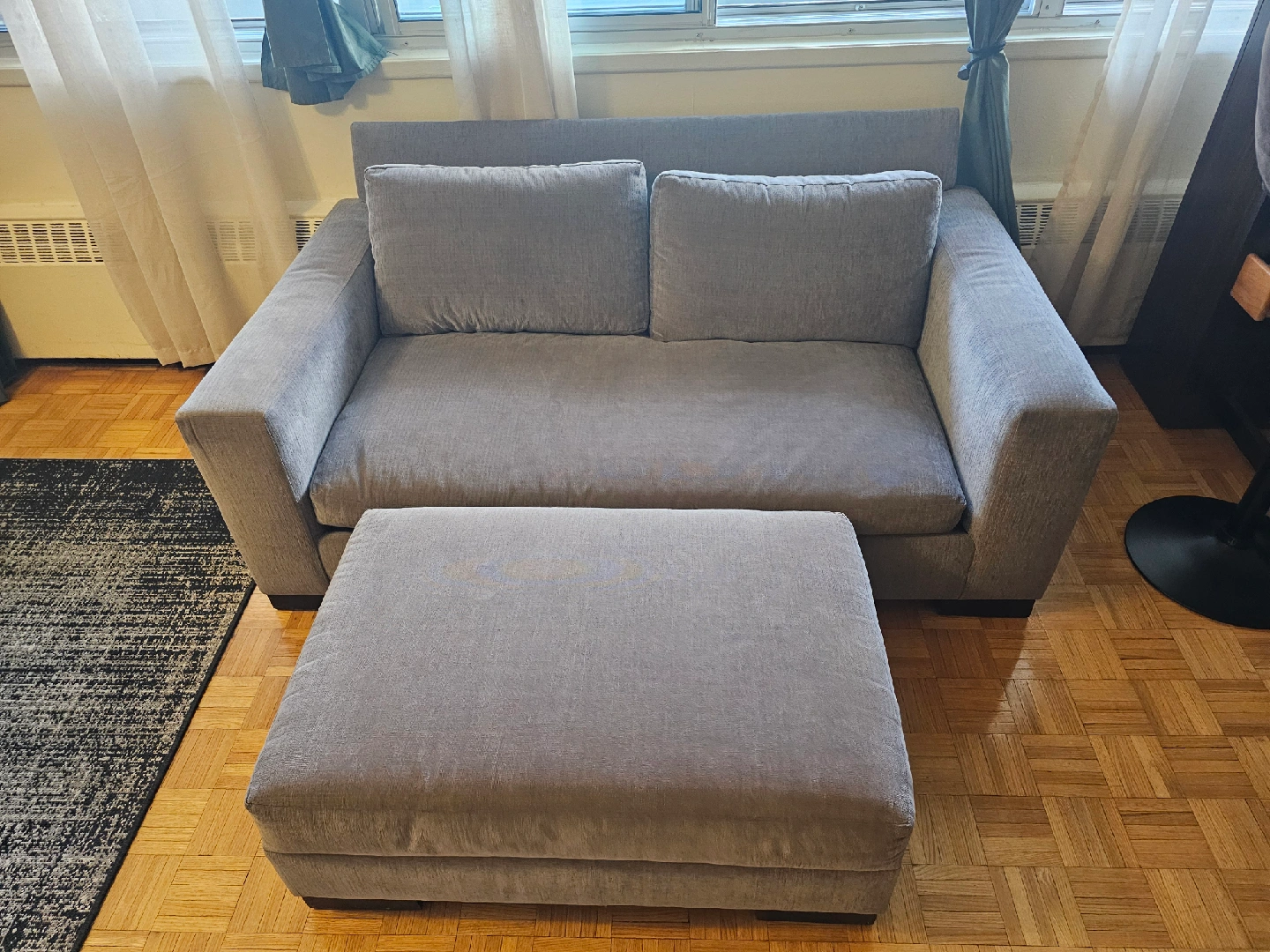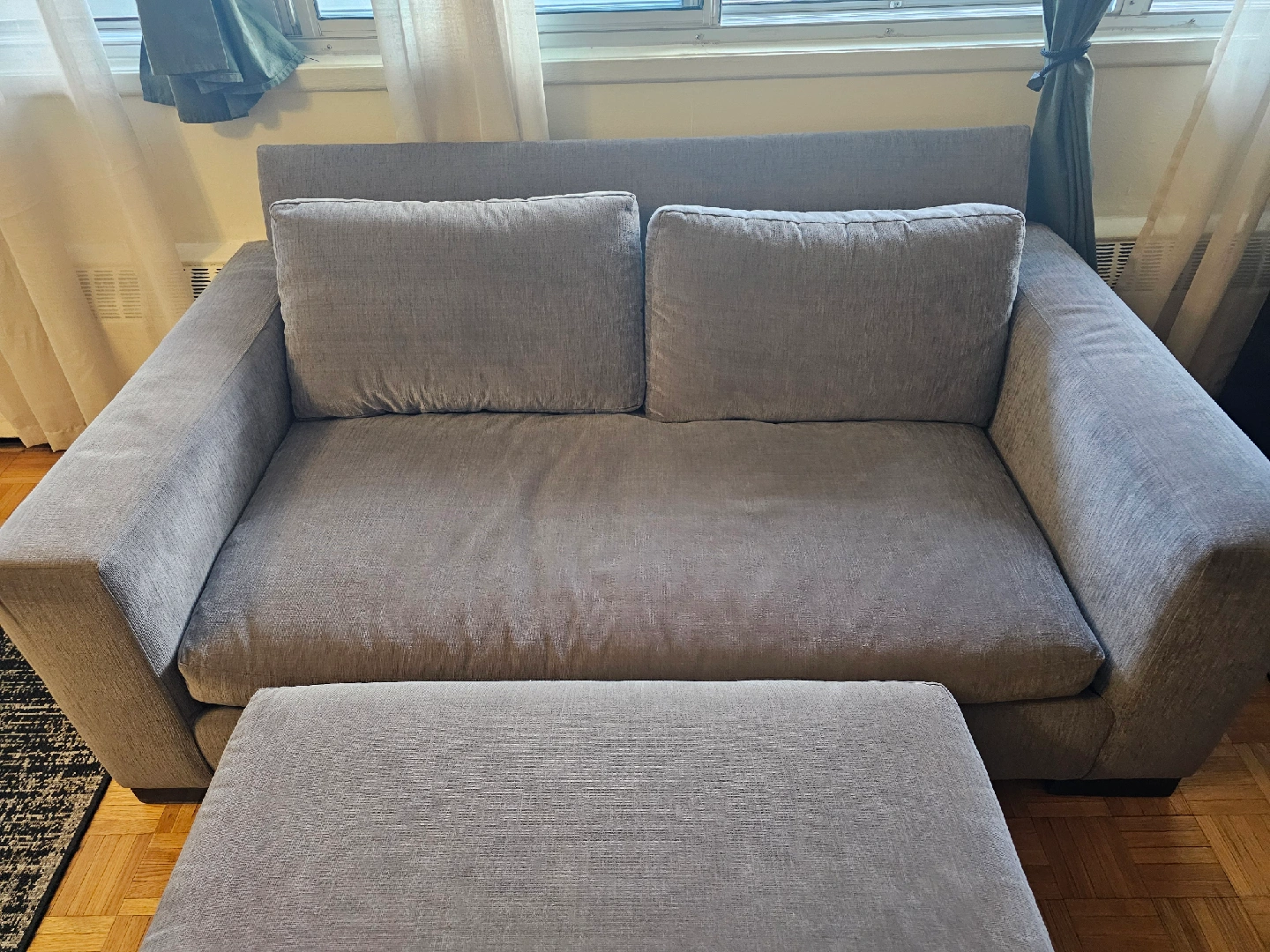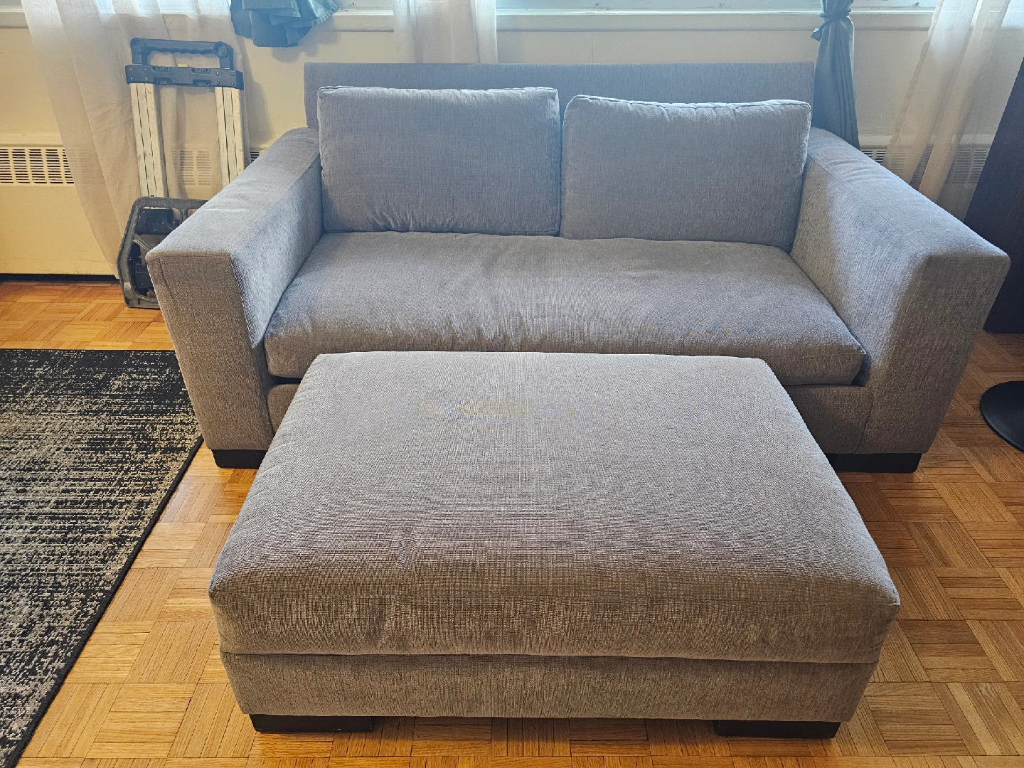 150Selling a comfortable grey loveseat sofa that comes with a matching ottoman. It's in great condition and perfect for a small living space or apartment. The loveseat features a modern design with thick cushions for extra comfort. The ottoman can be used as a footrest or extra seating. It is a great addition to any home! Pick up at Victoria Park Ellesmere Delivery may be an option for a fee depending on location