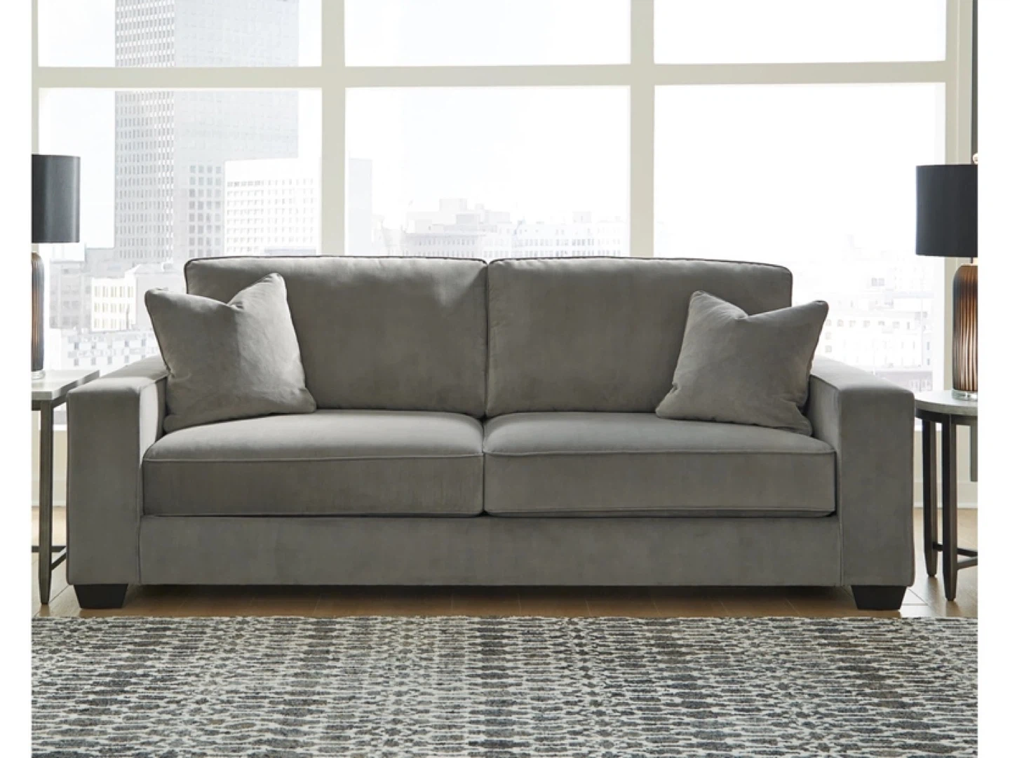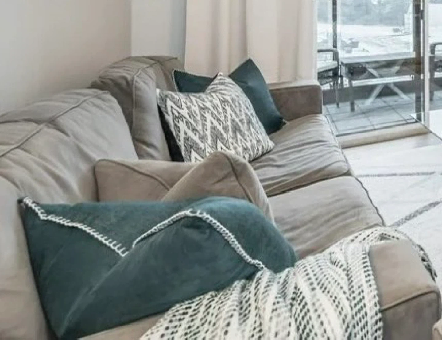 Comfortable grey sectional sofa. It includes multiple throw pillows and blankets as shown. Soft fabric material. Great for lounging or entertaining!