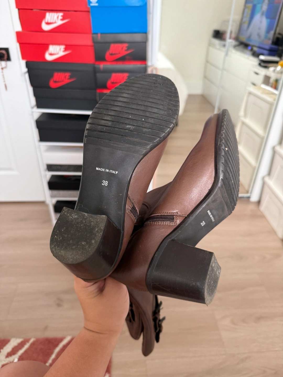Selling a pair of Lady Doc brown leather boots. They are size 38 and made in Italy. These boots have a stylish block heel and a unique design with buckle details. Check out all photos for reference as it is almost brand new.