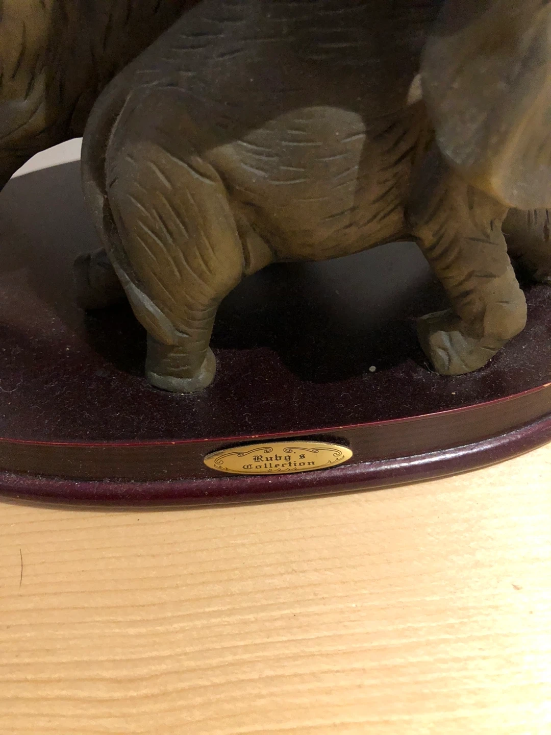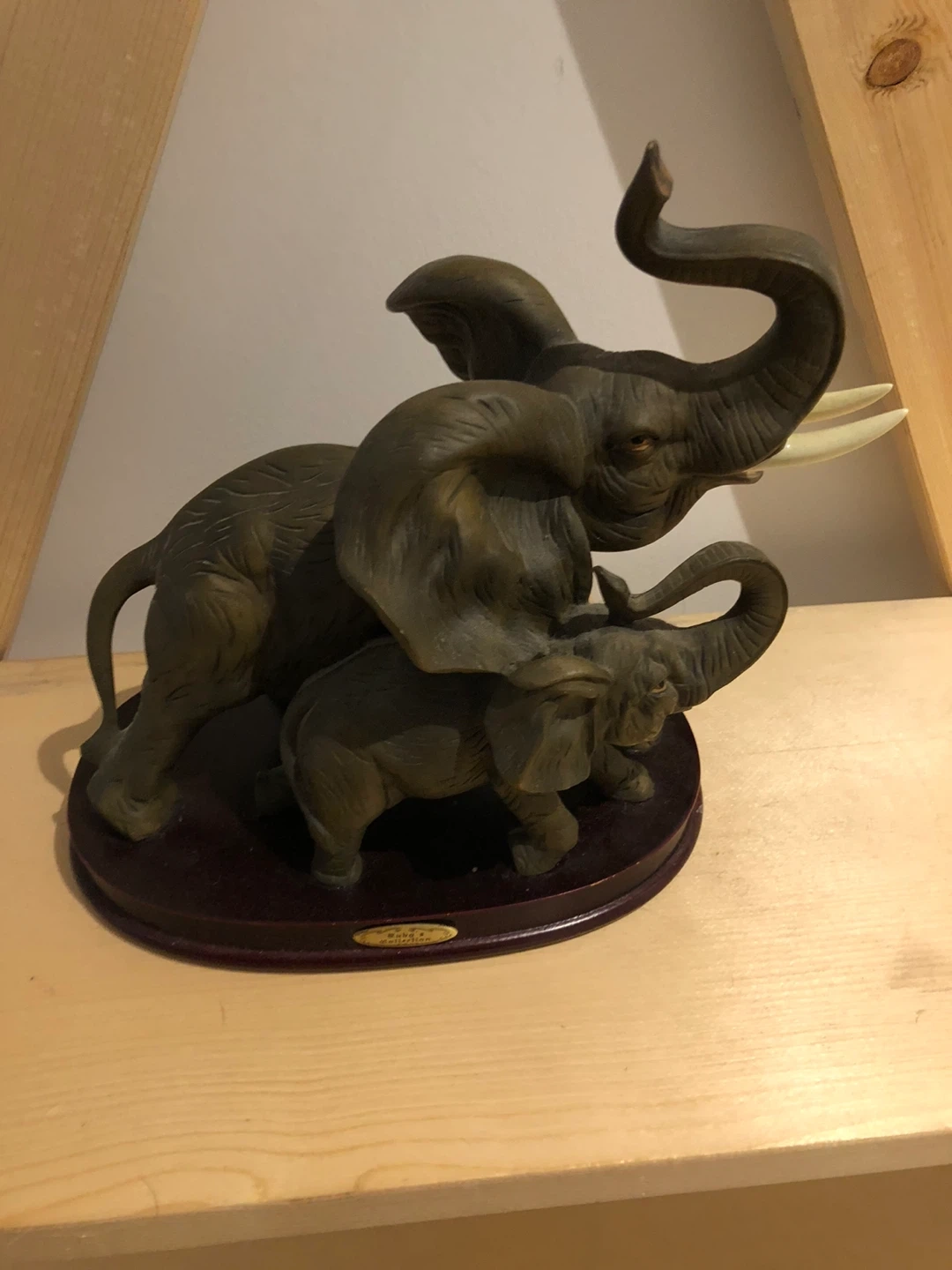 Here's a lovely figurine from Ruby's Collection! It features an elephant with its calf on a wooden base. It would make a great addition to any collection or as a decorative piece in your home