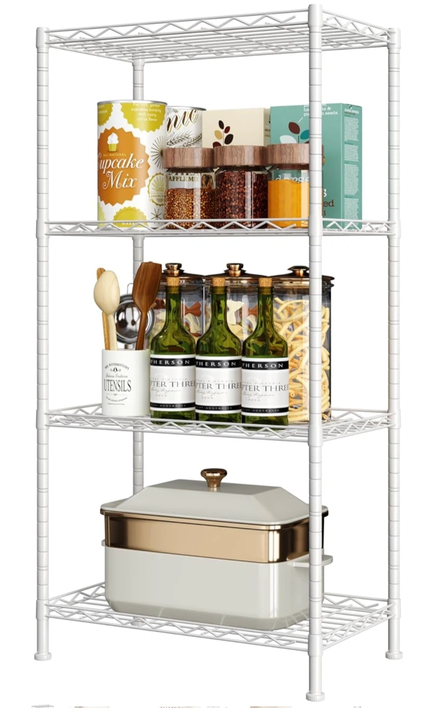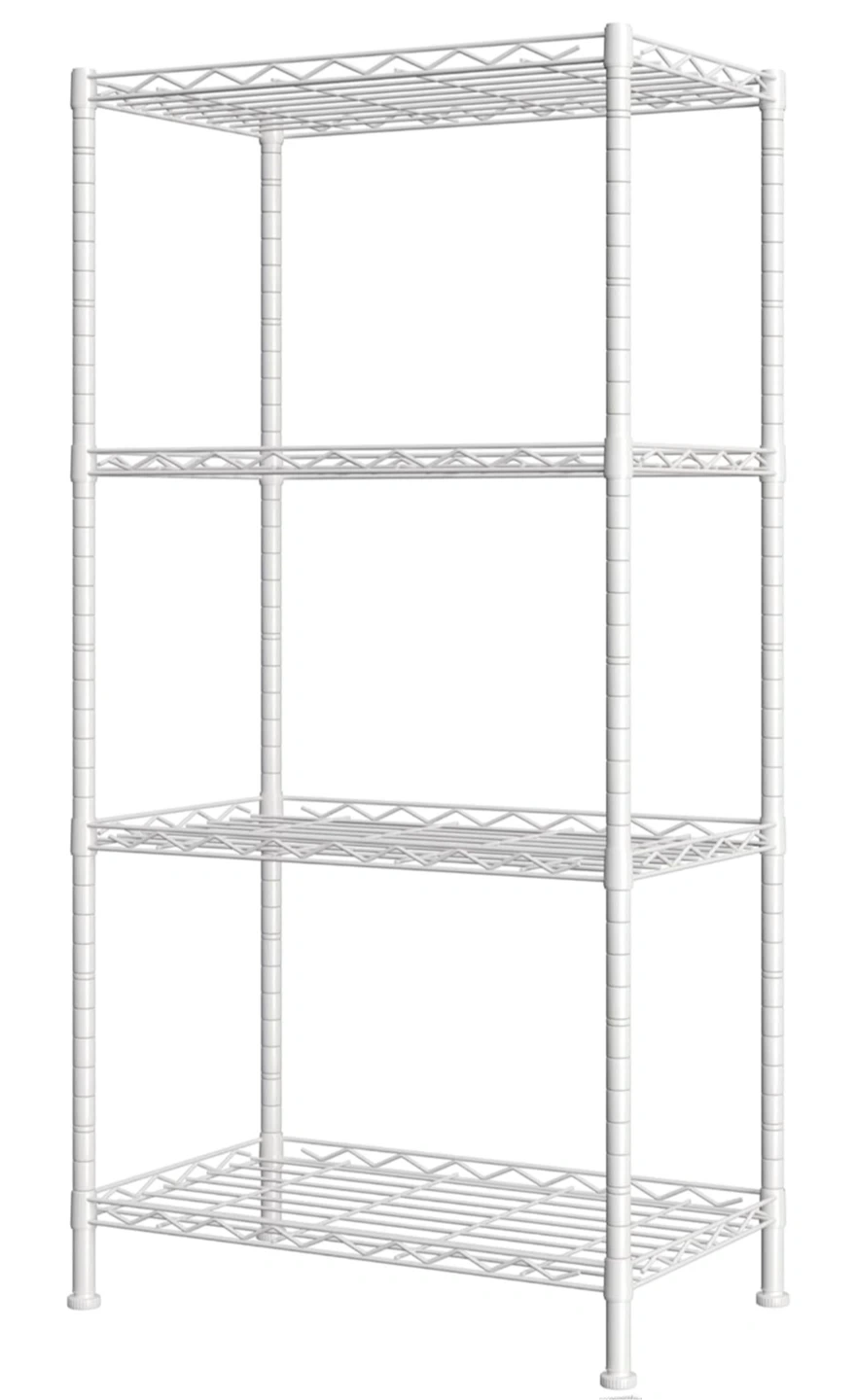 New in box Selling a handy white wire shelving unit! It's got 4 tiers and is easy to assemble. The height is adjustable, and it has adjustable leveling feet to keep everything nice and stable. Each shelf can hold up to 100lbs, and the dimensions are 42.5" tall, 21.2" wide, and 11.4" deep