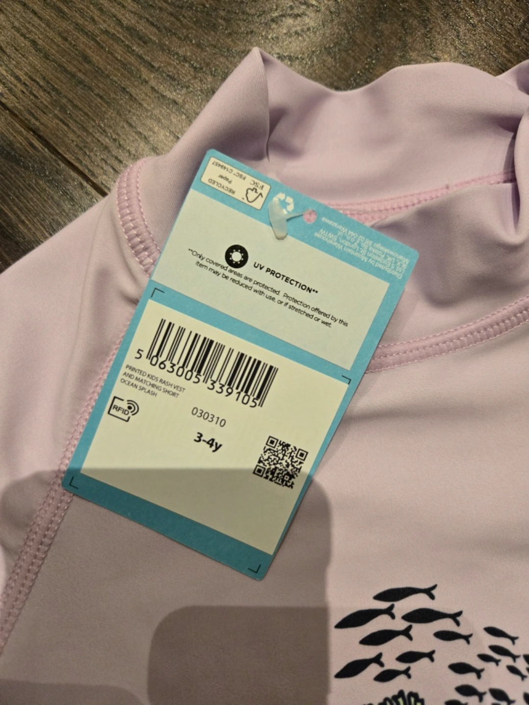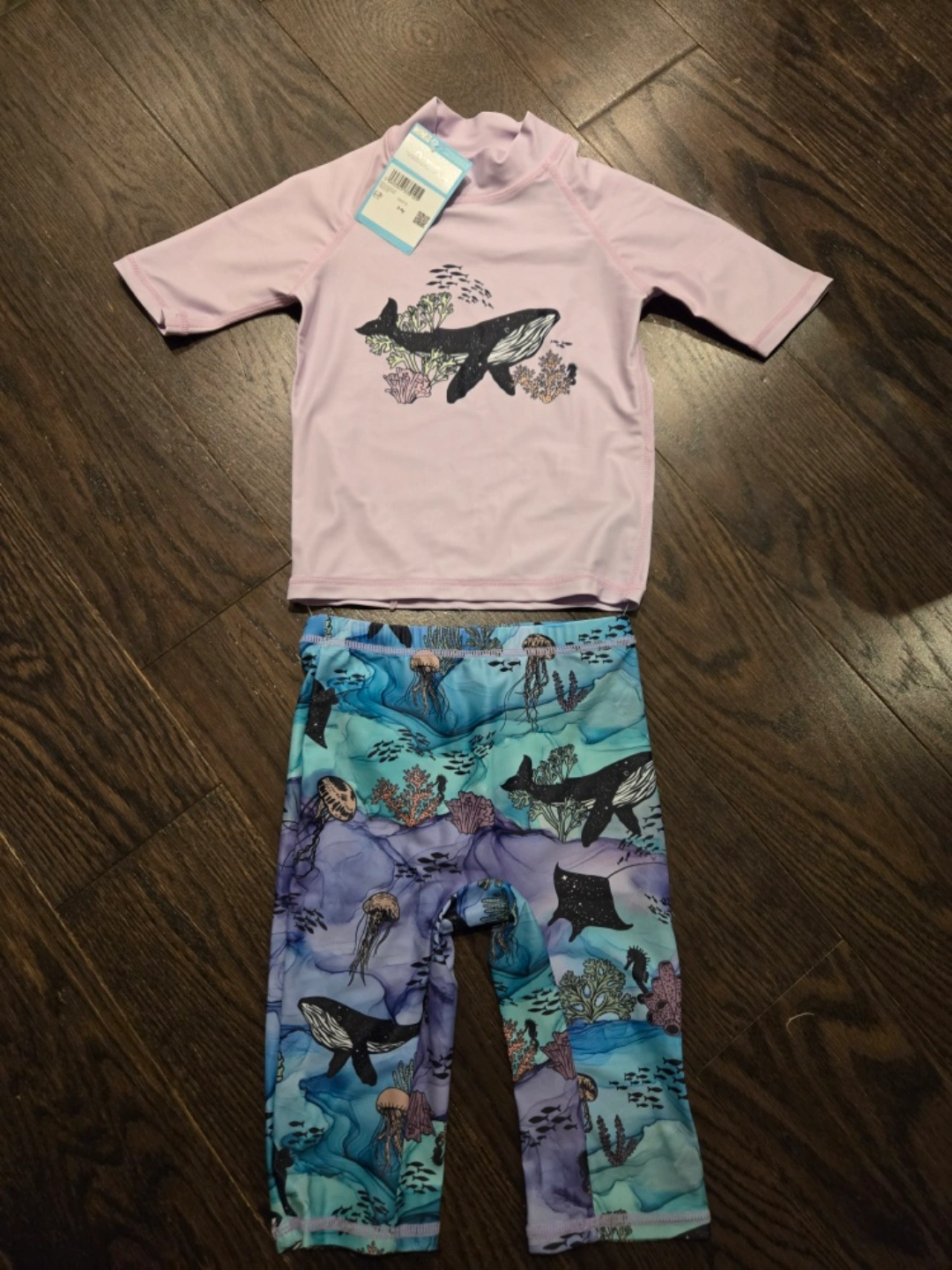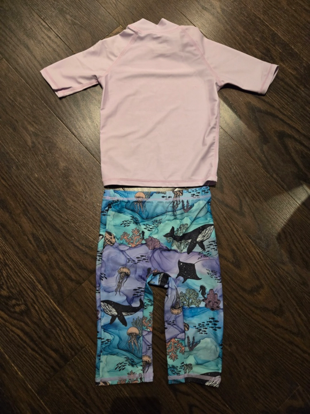 A cute rash vest and swim short set for kids! The top is a lovely light purple with a whale design and the bottoms have a fun sea creature pattern. Price is firm.