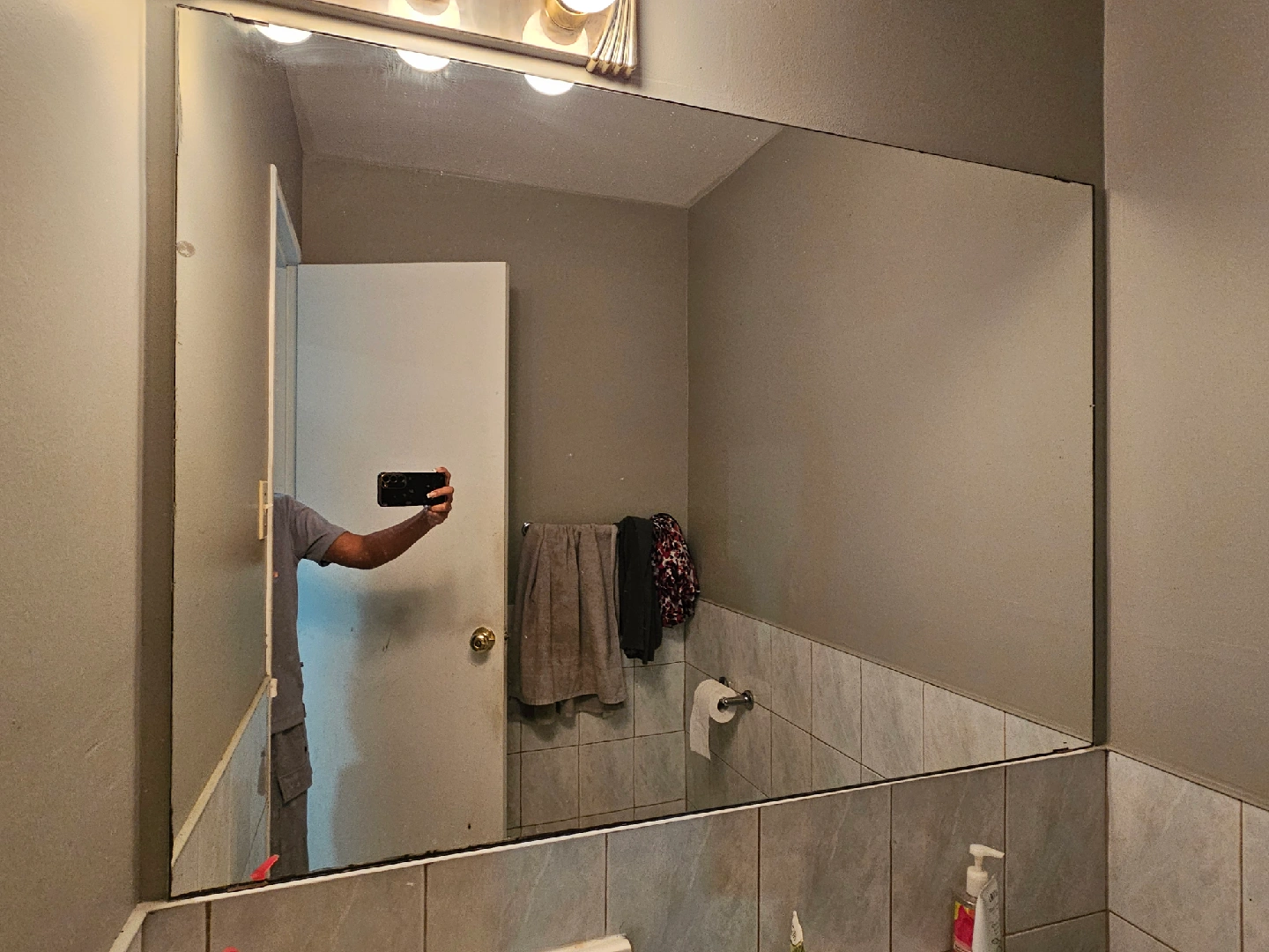 Selling a large frameless bathroom mirror. Simple, clean look – works well above a vanity or as a statement mirror in a gym, basement, or closet.