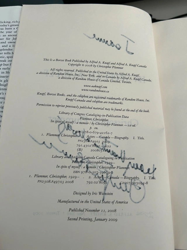 Signed/inscribed copy of 'In Spite of Myself: A Memoir' by Christopher Plummer. Hand signed by Christopher Plummer on the title page in thick black marker. 1st edition/2nd printing, hardcover, 2008. Condition: Used - Like new.