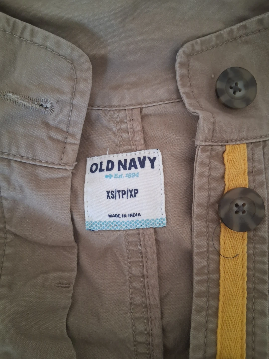 This is an Old Navy utility jacket. It's a size XS/TP/XP and made in India. The jacket has a zip front closure with button detailing. It features multiple pockets.