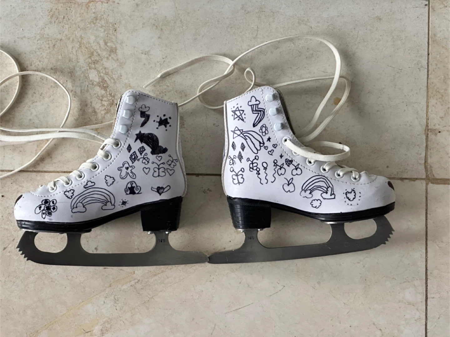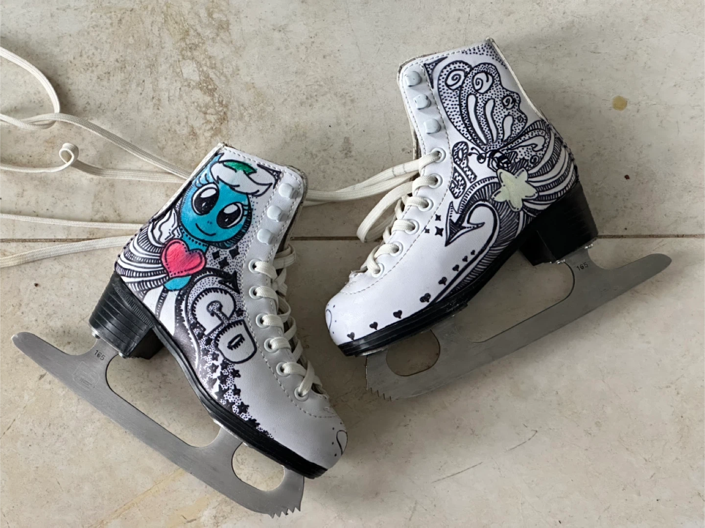 Girls White figure skates with unique hand-drawn designs featuring rainbows, butterflies, and a cute alien character. Blade size marked as 165.
