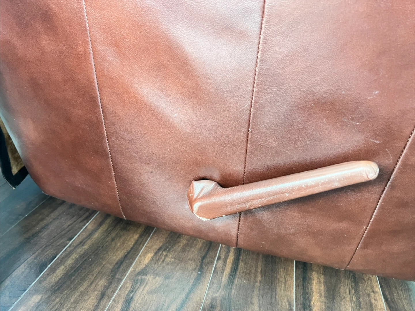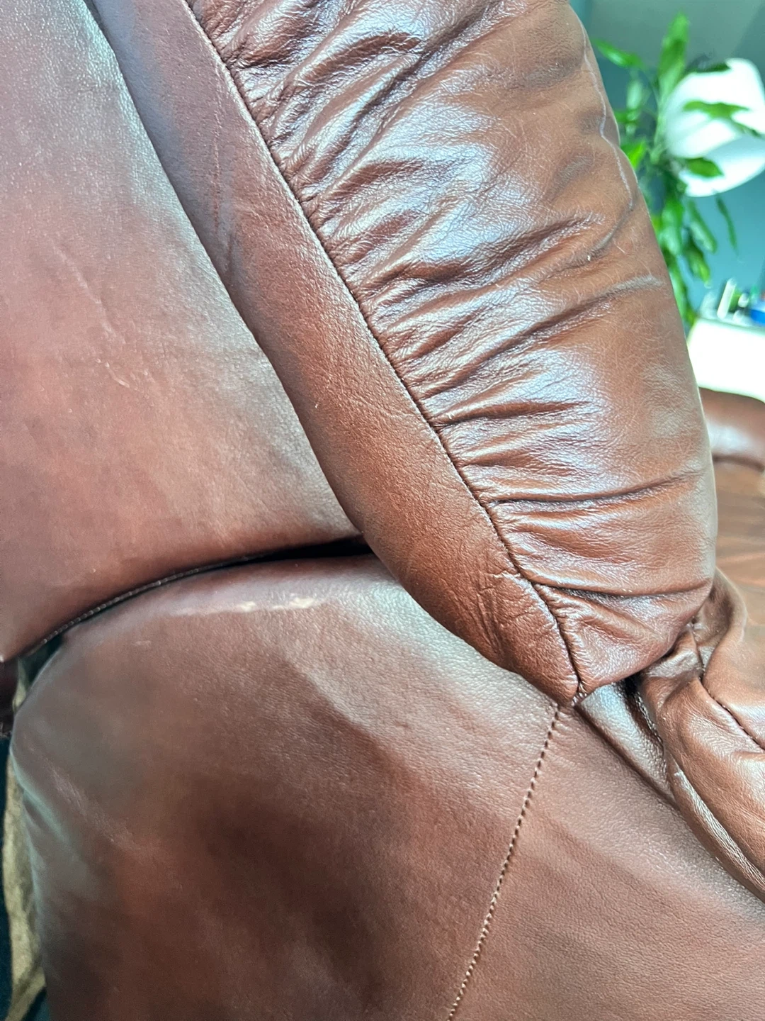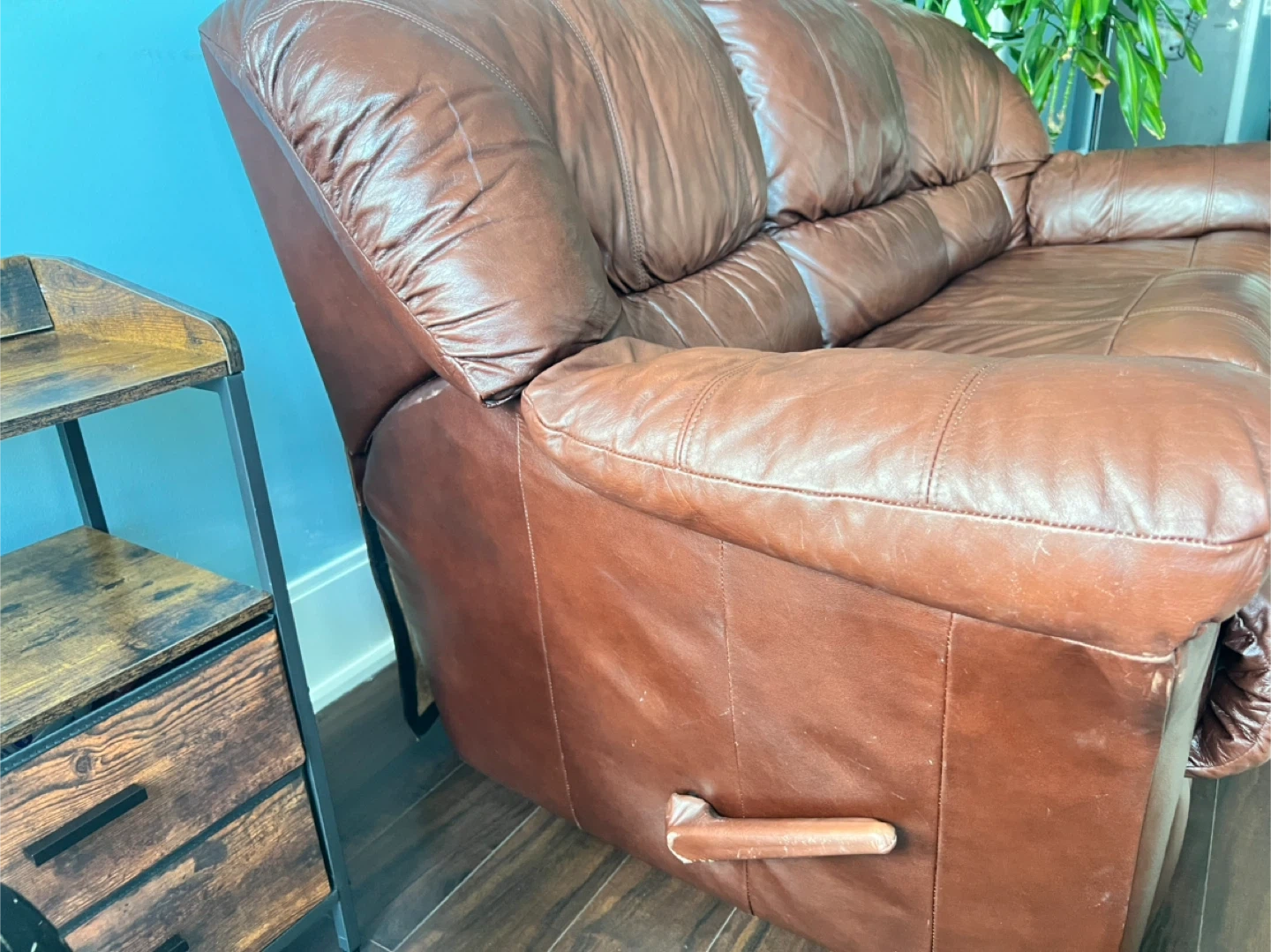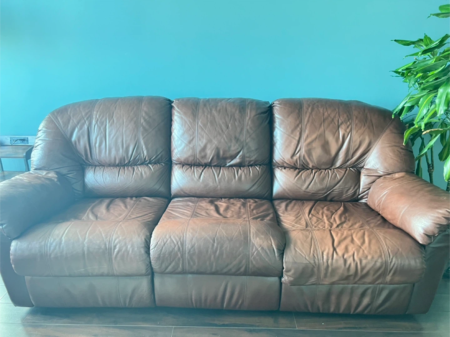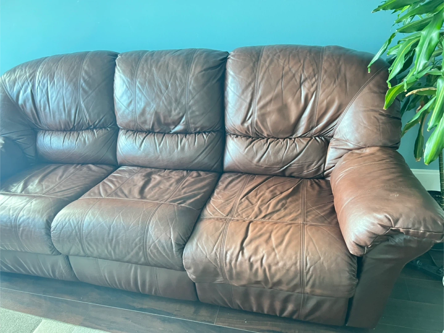 46Comfy brown leather sofa with reclining feature on the sides. It's a great addition to any living room for relaxing after a long day! The leather is soft and well-maintained. There are some signs of wear, but it's still in good condition and ready to be enjoyed Pickup only