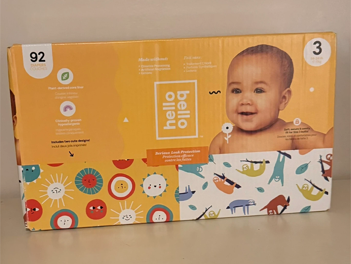 $20 Selling a box of Hello Bello diapers, size 3. The box contains 92 diapers. These diapers are made without chlorine processing, artificial fragrances, or lotions. They feature a plant-derived core liner and are clinically proven hypoallergenic. Includes two cute designs!