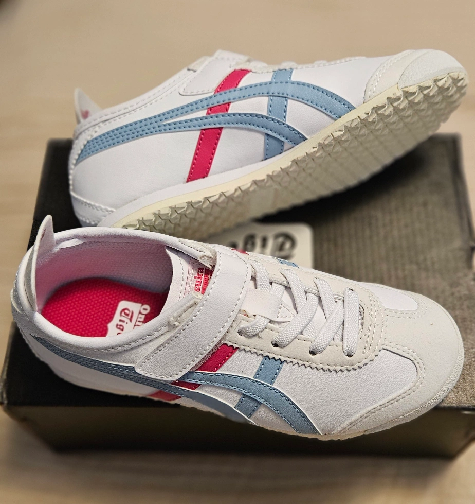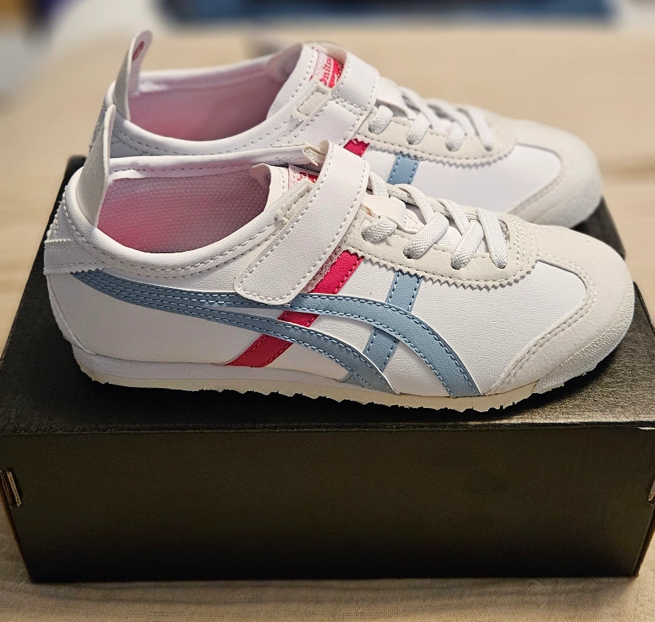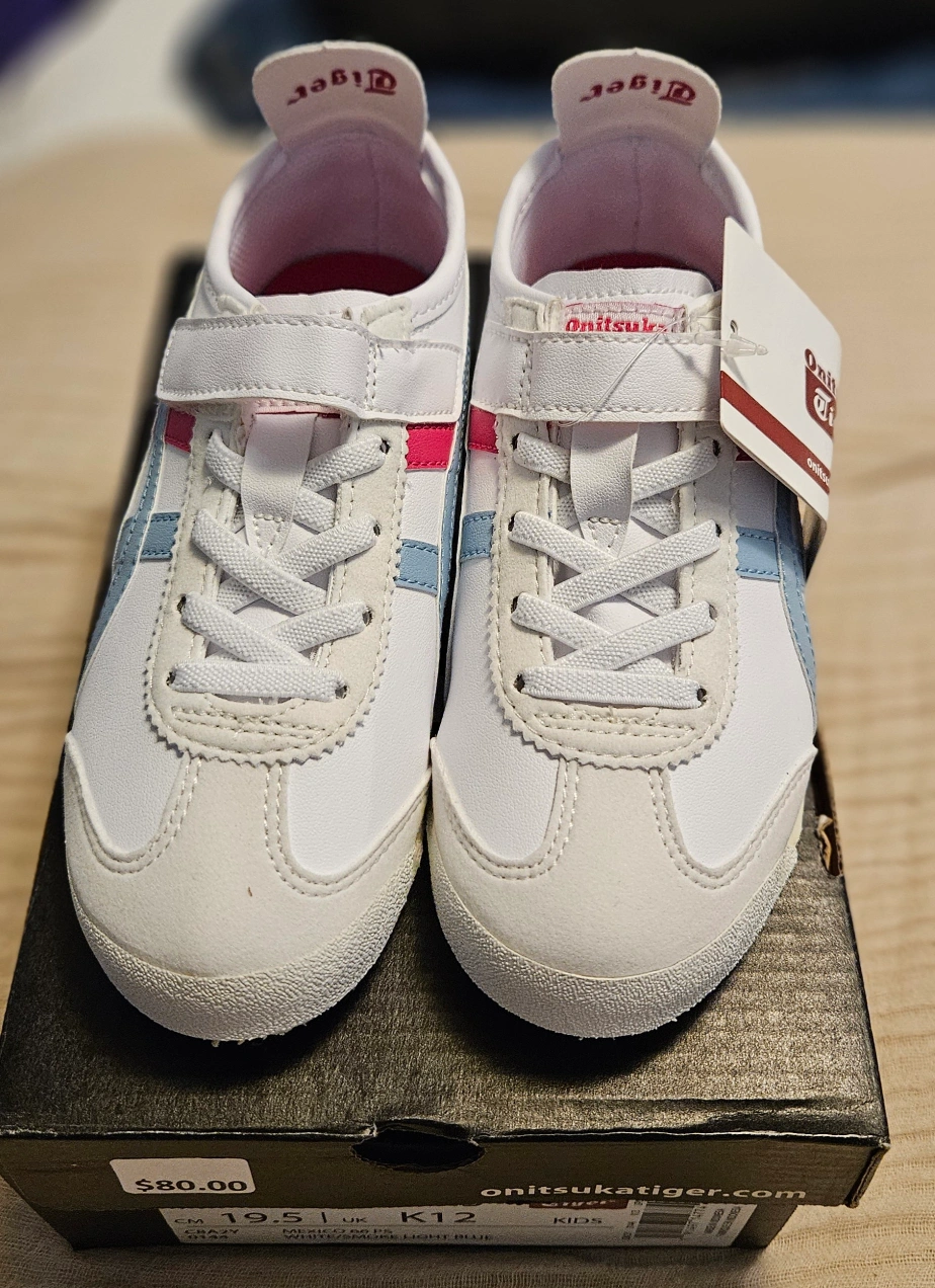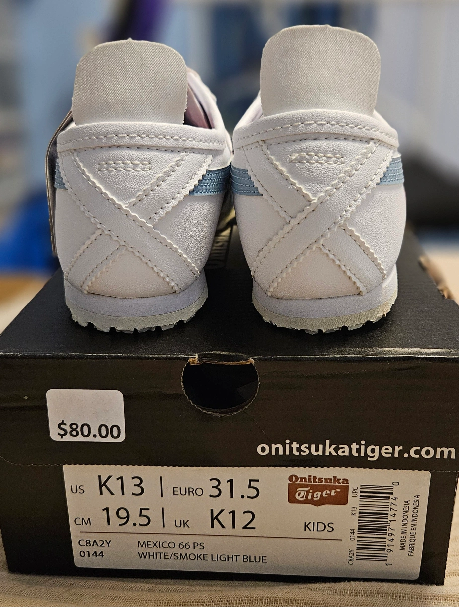 131These Onitsuka Tiger Mexico 66 PS kids' shoes are brand new and come in the original box! The colour is white/smoke light blue. The size is US K13, UK K12, EUR 31.5, and CM 19.5.