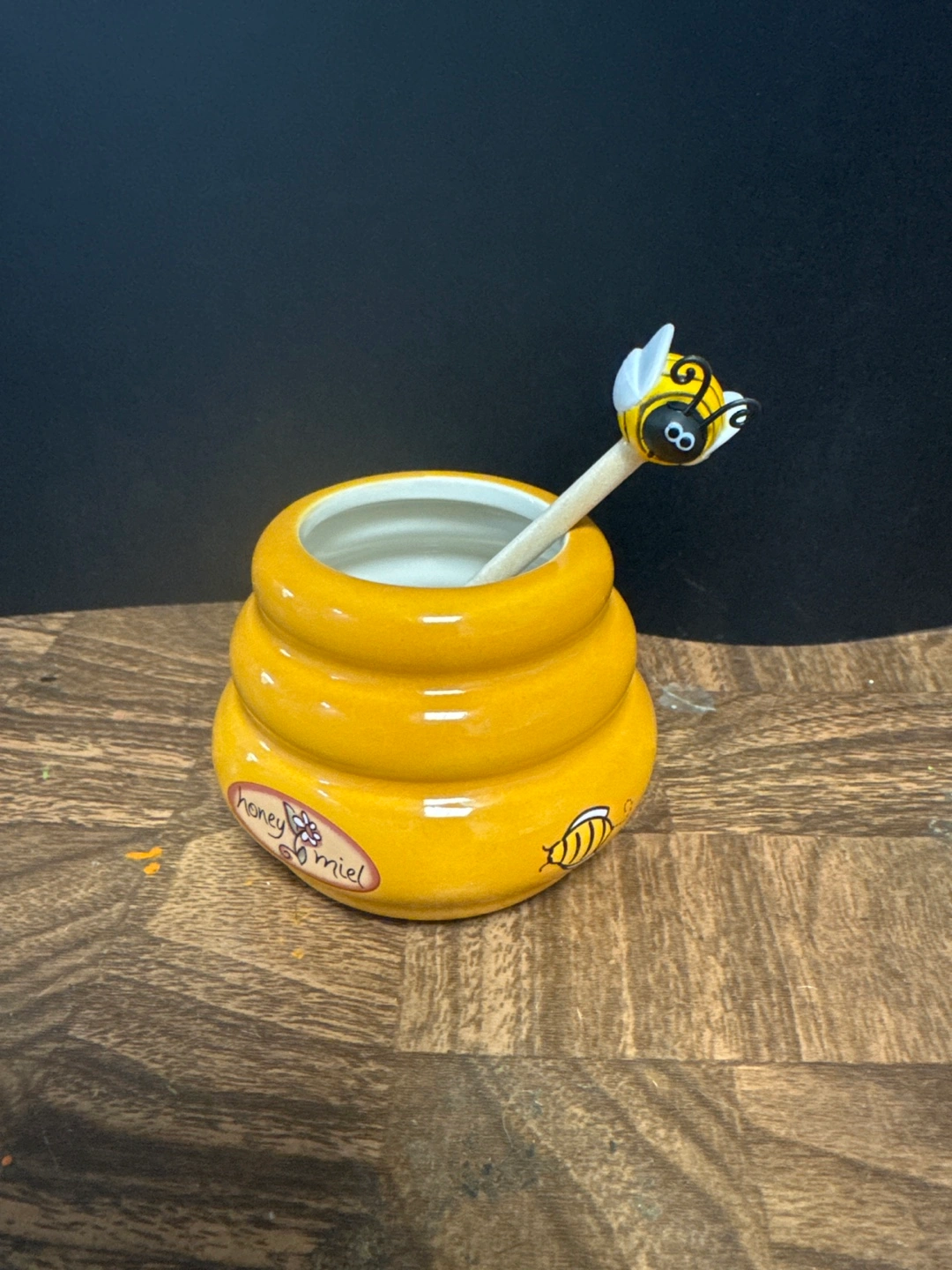 A cute ceramic honey pot shaped like a beehive, complete with a wooden dipper topped with a little bee!