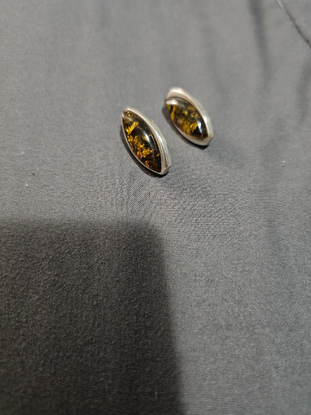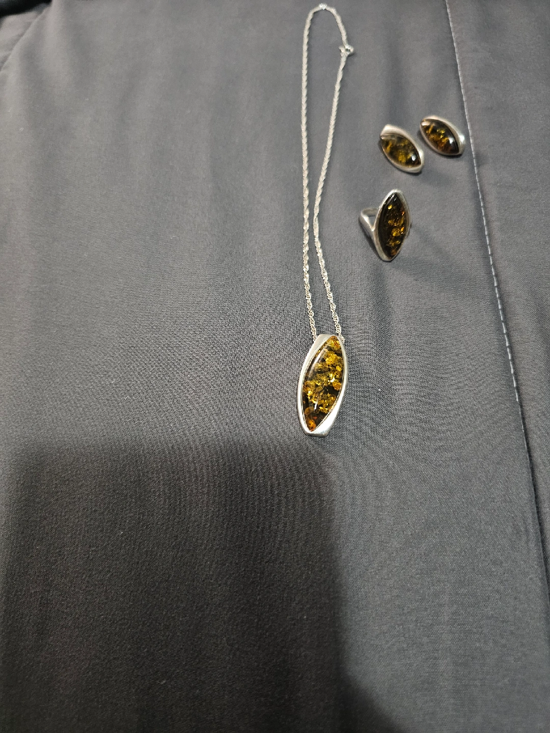 1000+Selling a beautiful set of amber jewelry! This includes a necklace, a ring, and a pair of earrings, all featuring unique amber stones set in silver-tone metal. The amber has lovely golden and brown inclusions. Perfect for adding a touch of natural elegance to any outfit Ring 7 Necklace 18"