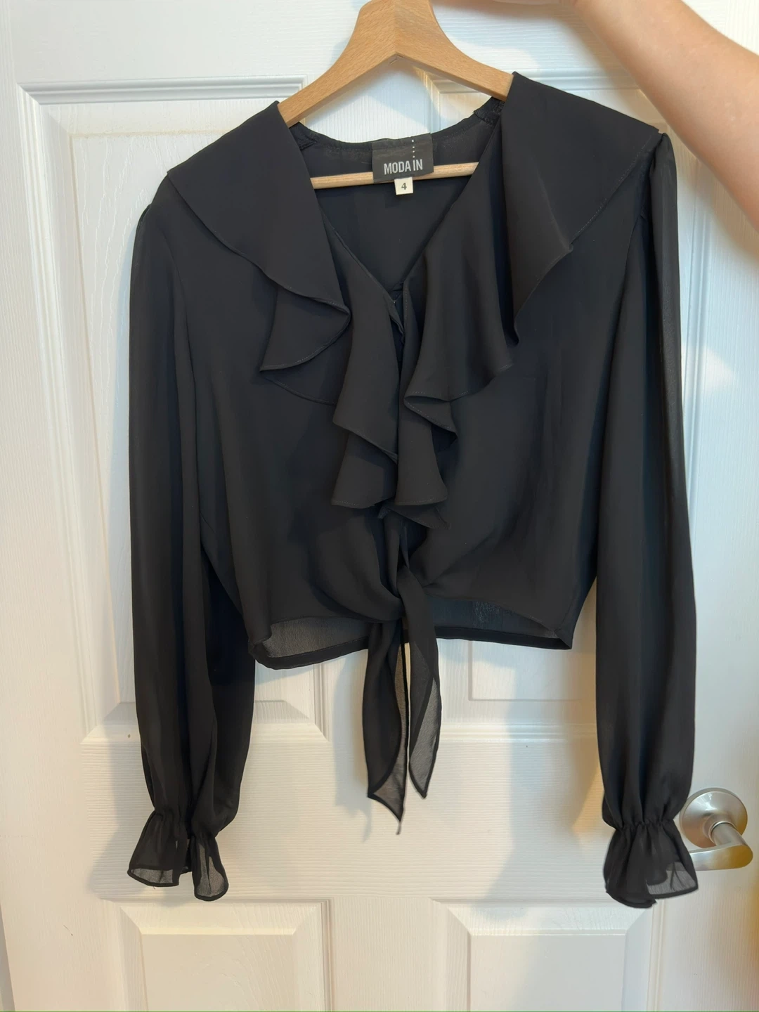 Buy & SellModa In Black Ruffle Blouse - Size SModa In Black Ruffle Blouse - Size S$15A stylish black blouse from Moda In, perfect for dressing up or down! It features a flattering ruffle design and a tie at the front. Size smallConditionNewSizesBrandModa InWHERE TO MEETCheck LocationView MapSELLERverifiedKiaraWillowdale E22317 reviews0 chats·0 favorites·9 views