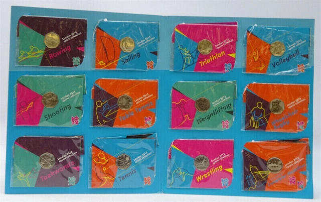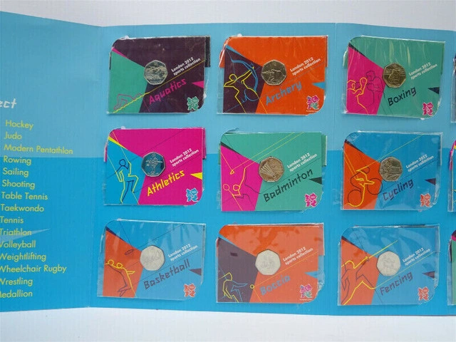 London 2012 complete sports collection of twenty-nine Olympic fifty pence pieces and a completer medallion, housed in The Royal Mint collector album. Brand new. SEALED VERSION COME WITH THE CARD IN PLASTIC WRAPPER AND ALBUM. 29 coin set + Completer Medallion. Feel free to message if you have any questions!