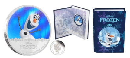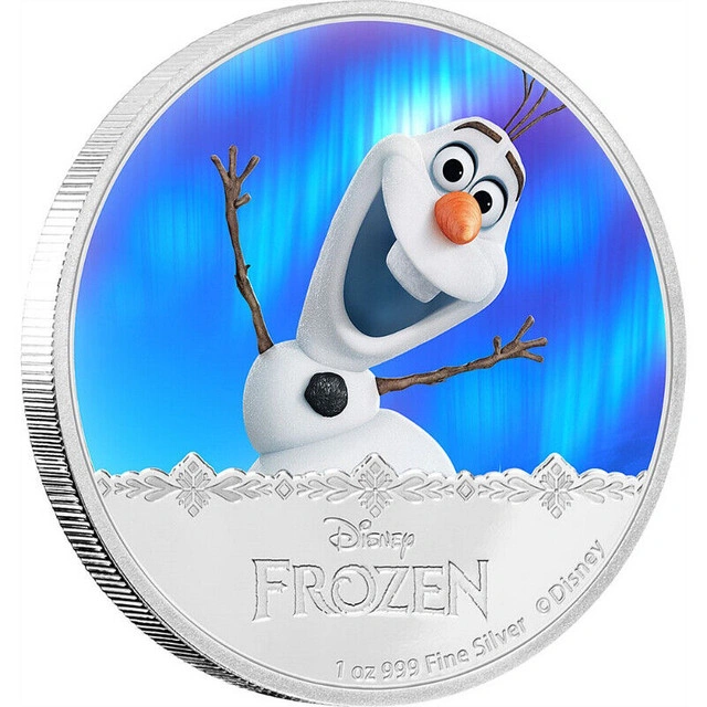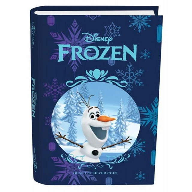 60OLAF – Disney Frozen Series – 2016 1 oz Silver Coin – New Zealand Mint Officially licensed by Disney Consumer Products with a limited mintage of 10,000 coins. The third coin release in the Disney Frozen – Magic of the Northern Lights collection. Contemporary, colourful coin and packaging design. Proof quality 1 oz Fine Silver coin. Presented in delightful fairytale book style packaging. Great present for any Disney princesses fan or Frozen fan. Coin Story: Curious, trusting and funny, Olaf wants to help everyone. Set in the kingdom of Arendelle, Disney’s animated film Frozen tells the story of the graceful Snow Queen Elsa, and her fearless sister Anna. Design Reverse Design: This coin design features an image of Olaf the enchanted snowman having fun, under the shimmering northern lights in the kingdom of Arendelle. Obverse Design: This features the Ian Rank-Broadley effigy of Her Majesty Queen Elizabeth II. Packaging: This Olaf coin comes presented in delightful fairy-tale book style packaging. The themed packaging makes this coin an ideal gift for any Disney fan or coin collector. The Certificate of Authenticity is printed onto the packaging. Specifications Mintage: 10,000 Material: Fine Silver (99.9%) Finish: Proof/Coloured Weight: 1 oz Diameter: 40mm COA: Yes Country: Niue Face Value: $2.00 Condition: New More Info: Other Cash accepted: Yes Cashless payment: Yes For Sale By: Owner Curbside pick up: Yes