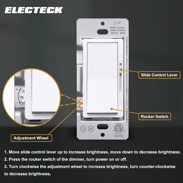 ELECTECK Ultra Slim Dimmer Light Switch, Single Pole or 3 Way, Widely Compatible with Dimmable LED/CFL/Incandescent and Halogen Bulbs, 15A/120V, Wall Plate Included, ETL Listed 5 packages available. Perfectly works with dimmable LED/CFL bulbs (up to 300W) and incandescent/halogen bulbs (up to 600W). 15A/120V/60Hz. No Neutral Wire Required, Screwless wallplate included. Ultra-slim profile easily fits in electrical box and wall plate. Faster & easy installation with detailed installation manual. Works for both singe pole and 3 way applications. In a 3-way circuit, only one dimmer can be used. Feel free to message if you have any questions!