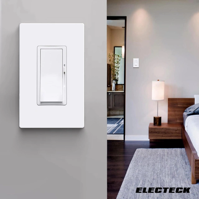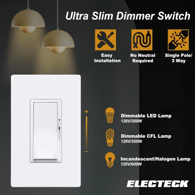 ELECTECK Ultra Slim Dimmer Light Switch, Single Pole or 3 Way, Widely Compatible with Dimmable LED/CFL/Incandescent and Halogen Bulbs, 15A/120V, Wall Plate Included, ETL Listed 5 packages available. Perfectly works with dimmable LED/CFL bulbs (up to 300W) and incandescent/halogen bulbs (up to 600W). 15A/120V/60Hz. No Neutral Wire Required, Screwless wallplate included. Ultra-slim profile easily fits in electrical box and wall plate. Faster & easy installation with detailed installation manual. Works for both singe pole and 3 way applications. In a 3-way circuit, only one dimmer can be used. Feel free to message if you have any questions!