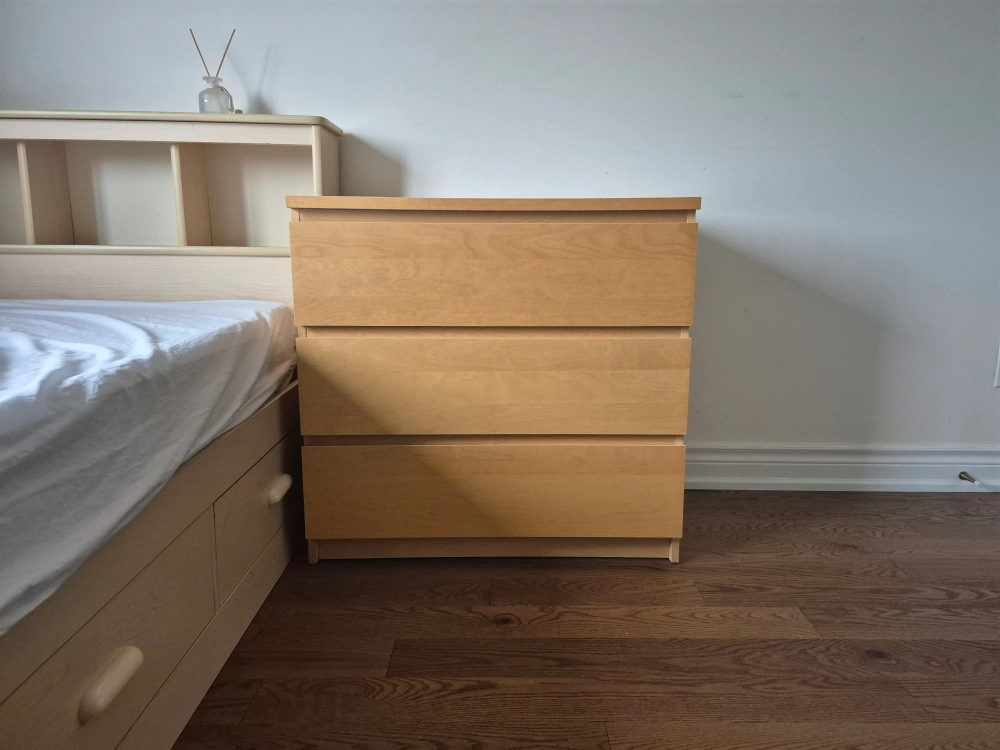 70Selling a gently used IKEA Malm dresser with three drawers! It's in a birch veneer finish and is perfect for adding some storage to your bedroom or any other space in your home. It's a simple and classic design that fits well with most decor styles