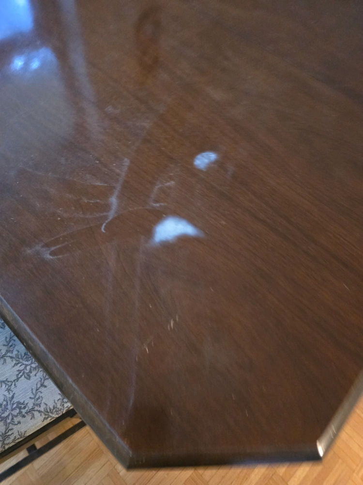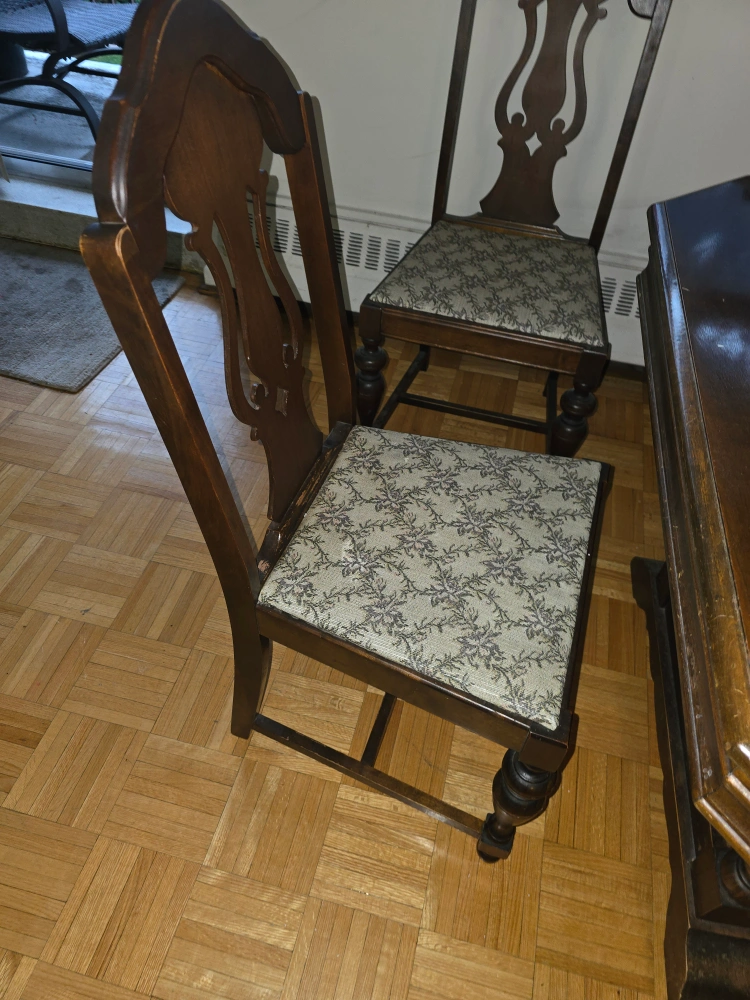 Selling a beautiful antique dining table set! It comes with five chairs. The table and chairs have a lovely dark wood finish and patterned fabric seats. There are some signs of wear on the table top, as shown in the photos, but overall it's a stunning set for your dining room!