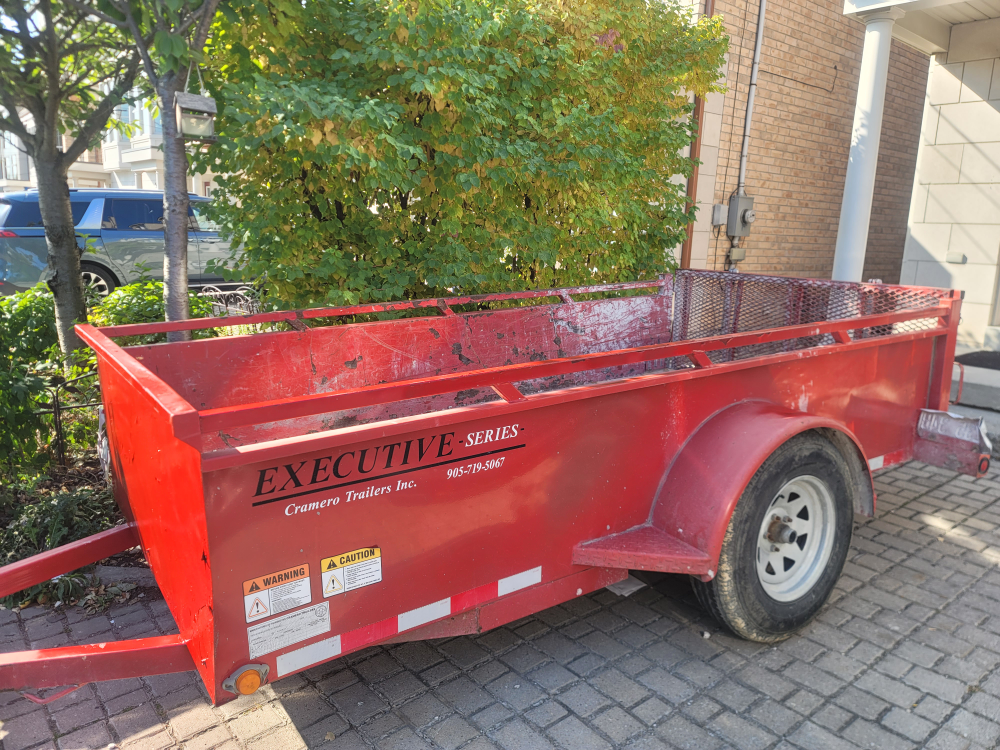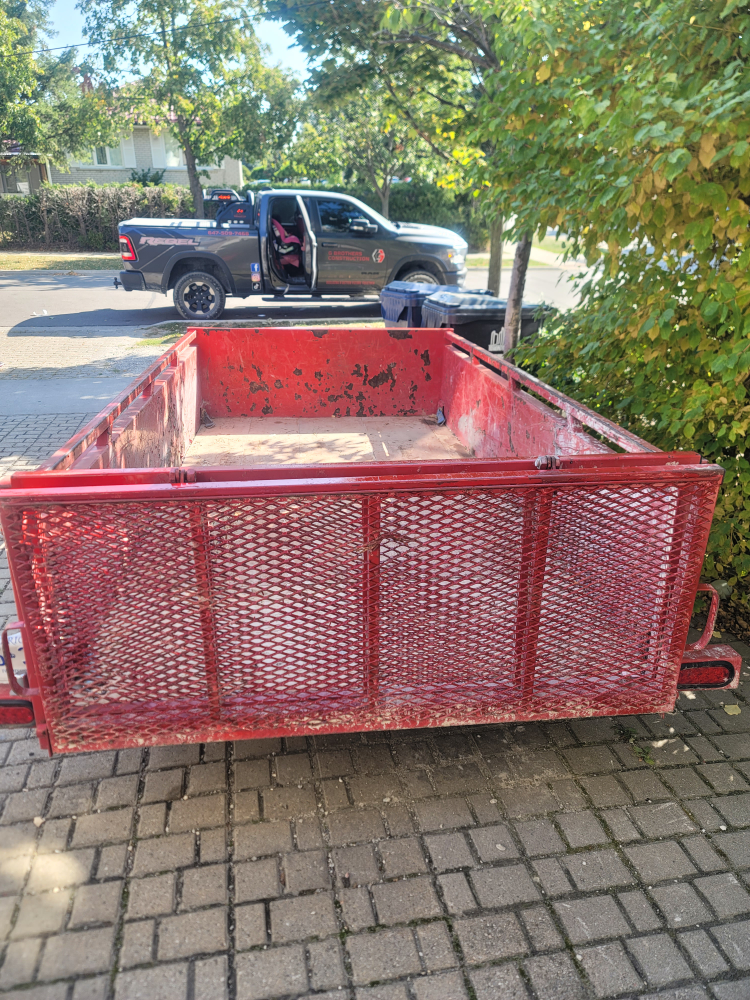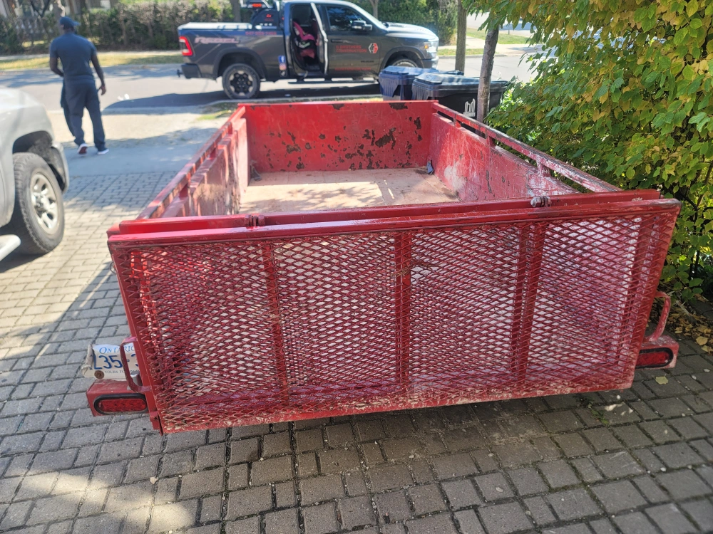 Selling reliable red utility trailer for sale. Although it shows some signs of wear, it remains functional and is perfect for hauling heavy loads and works perfectly for construction works.