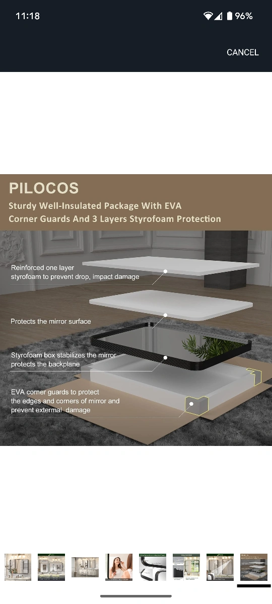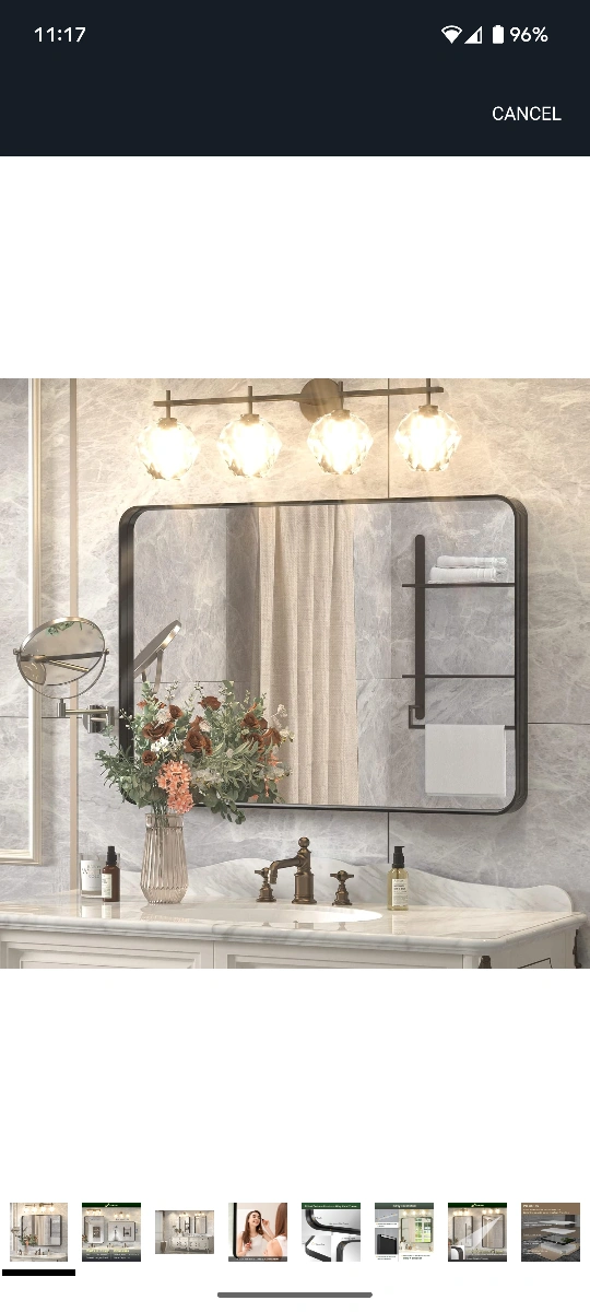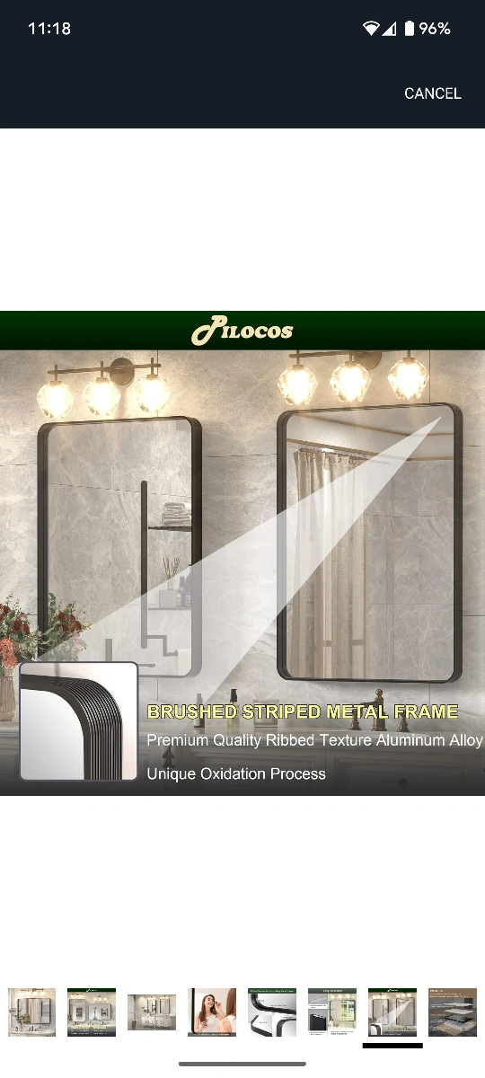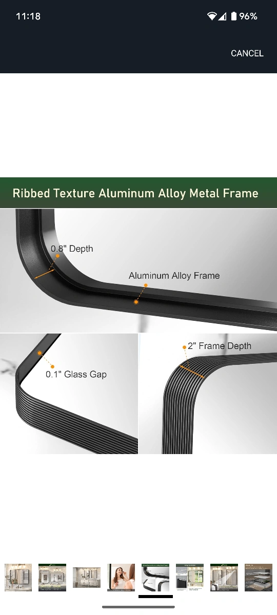Selling a brand new Flocos bathroom mirror! It is 36 inches in length and 30 inches in width. The frame depth is 2 inches. It has a ribbed texture with an aluminum alloy metal frame. Included in the box are the mirror, user manual, screws and hanging board