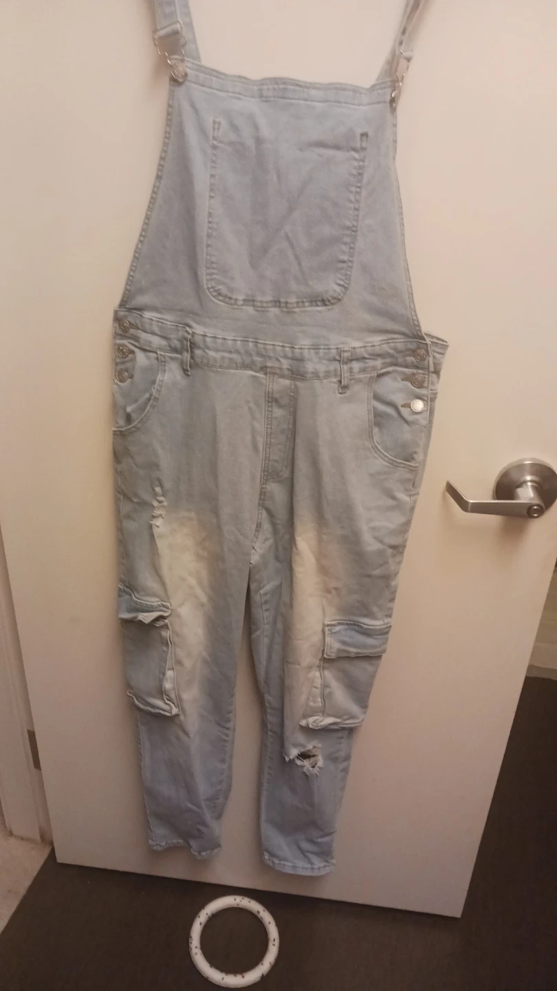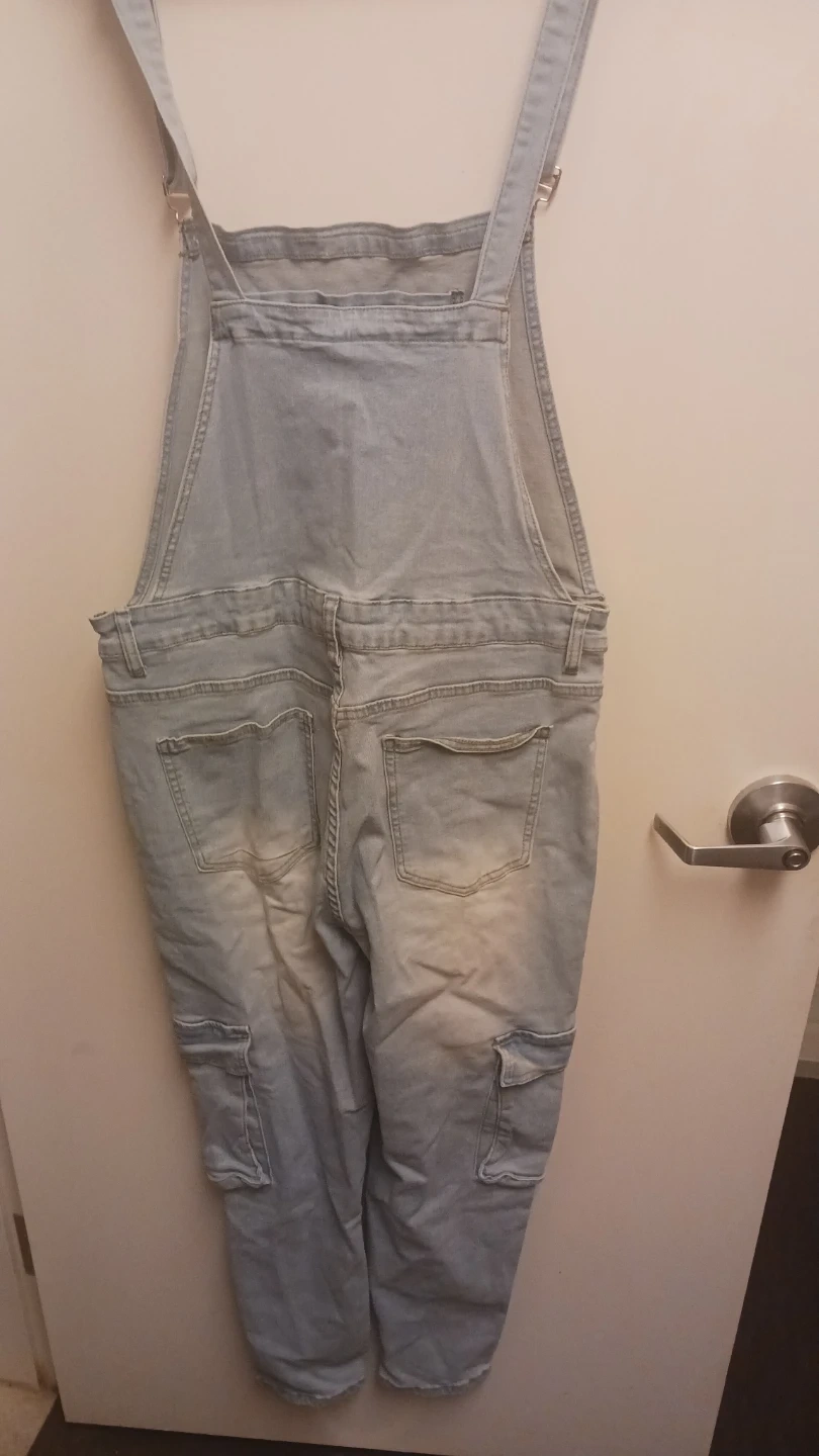 Selling a pair of light blue denim overalls in size XL. They're made of 70% cotton, 28% polyester, and 2% elastane. Cool overall straps that hang for style! They have a unique style, made to be worn folded down... and are in excellent condition! Paid $44.