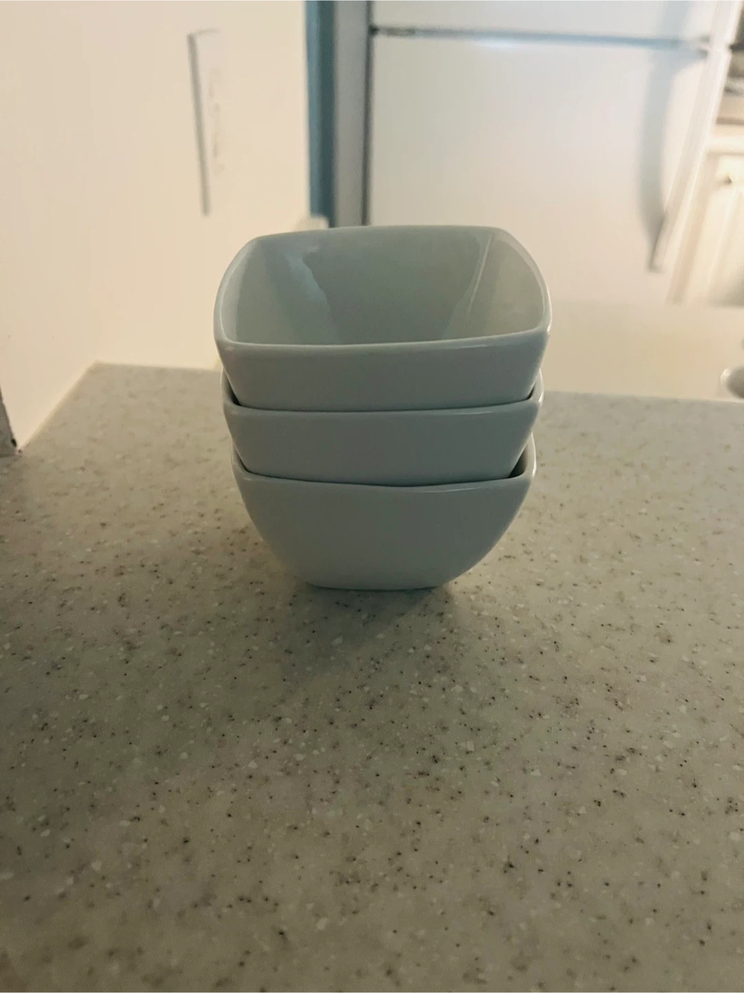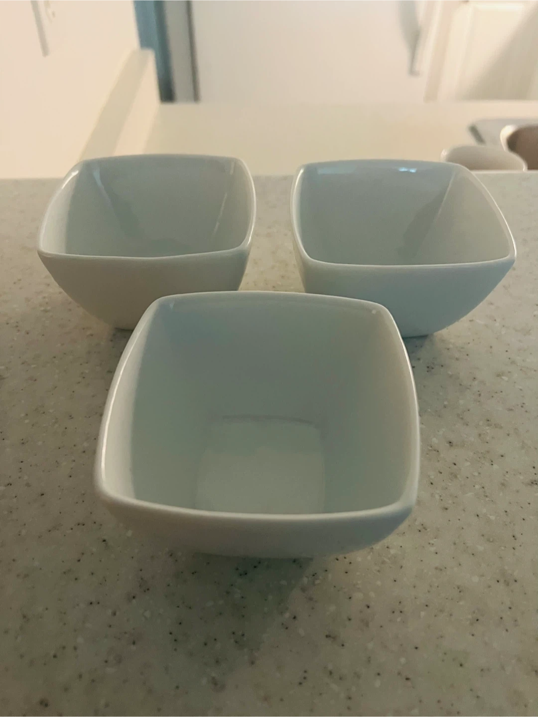Selling a set of three small white bowls. They're in great condition and perfect for snacks, dips, or side dishes. They have a simple, clean design that will fit in with any decor