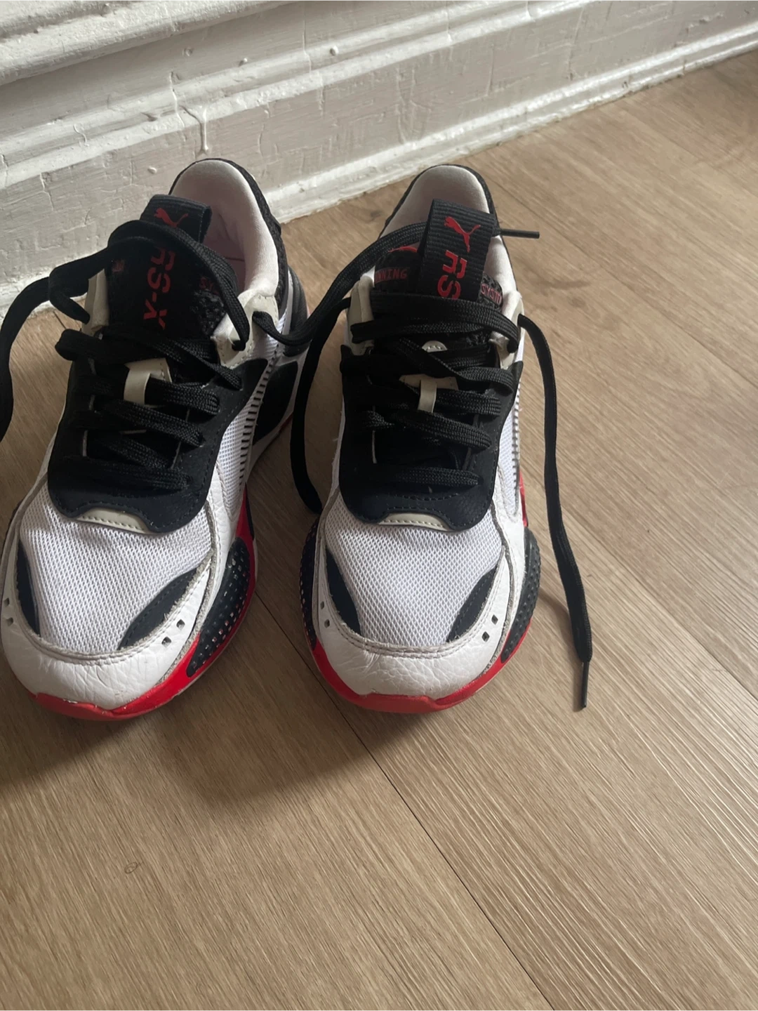 10Selling a pair of Puma RS-X running shoes. They are white, black, and red. They show signs of wear.