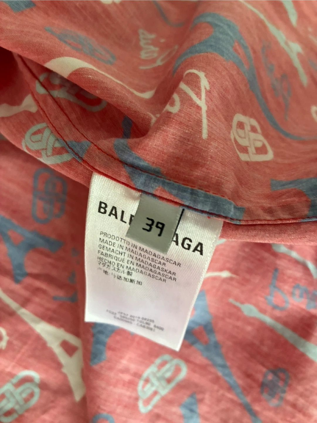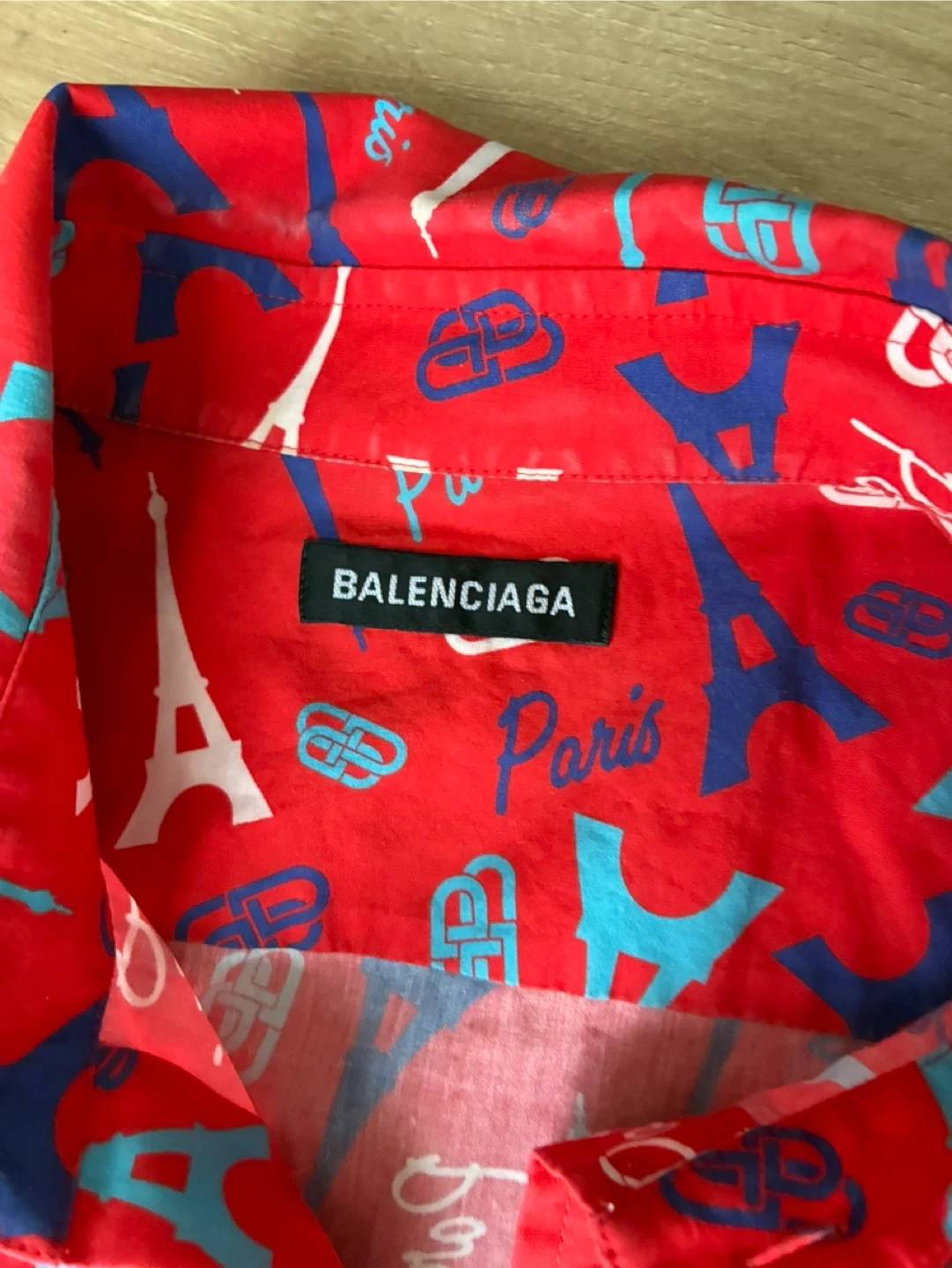 104Selling a Balenciaga button-down shirt with a fun Paris print! The shirt features a vibrant red color with blue and white accents. The size is 39