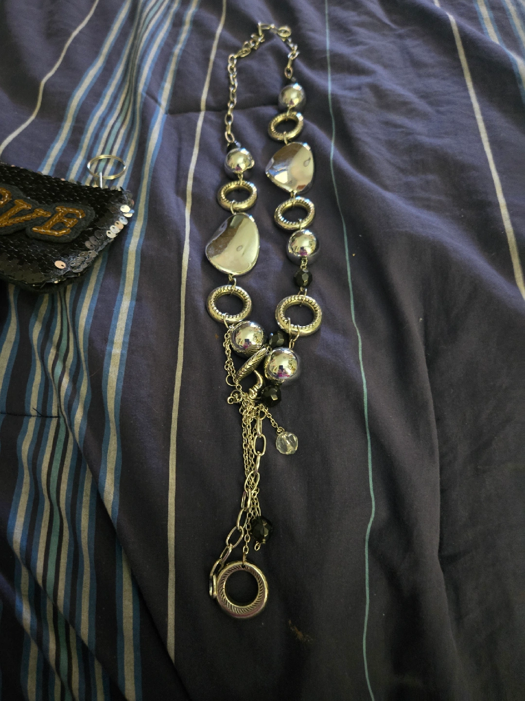 Selling a silver-tone statement necklace! It features a variety of shapes and textures, including round beads, flat, polished stones, and dangling chains with black accents. It's a stylish piece to add some flair to any outfit!