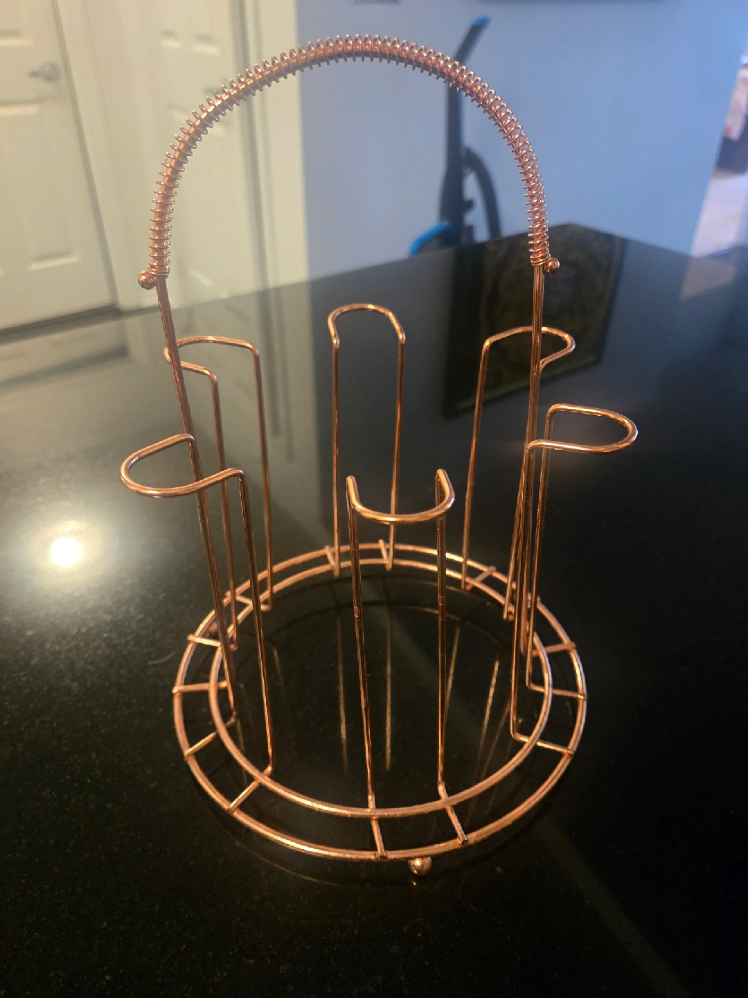 Here's a neat copper-coloured mug rack! It's in great shape and ready to hold your favourite mugs or glasses. Adds a touch of rustic charm to your kitchen or dining area