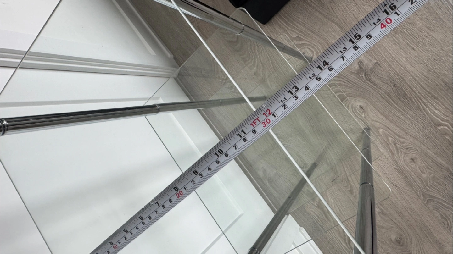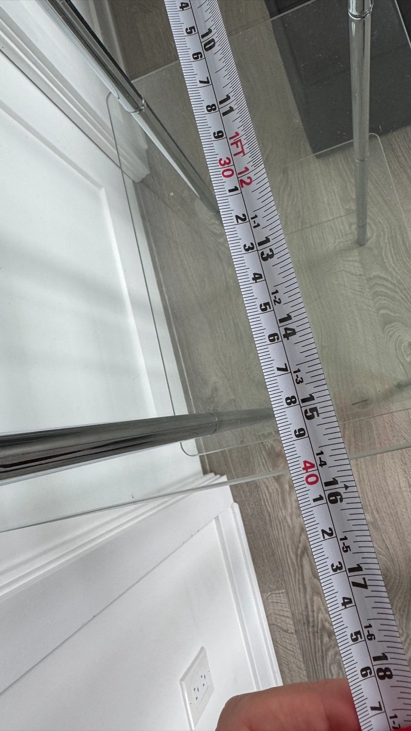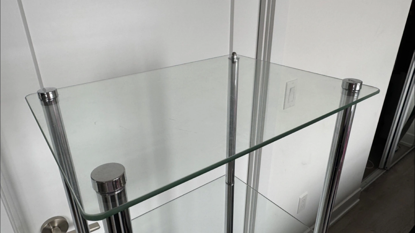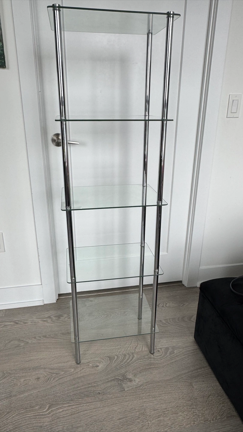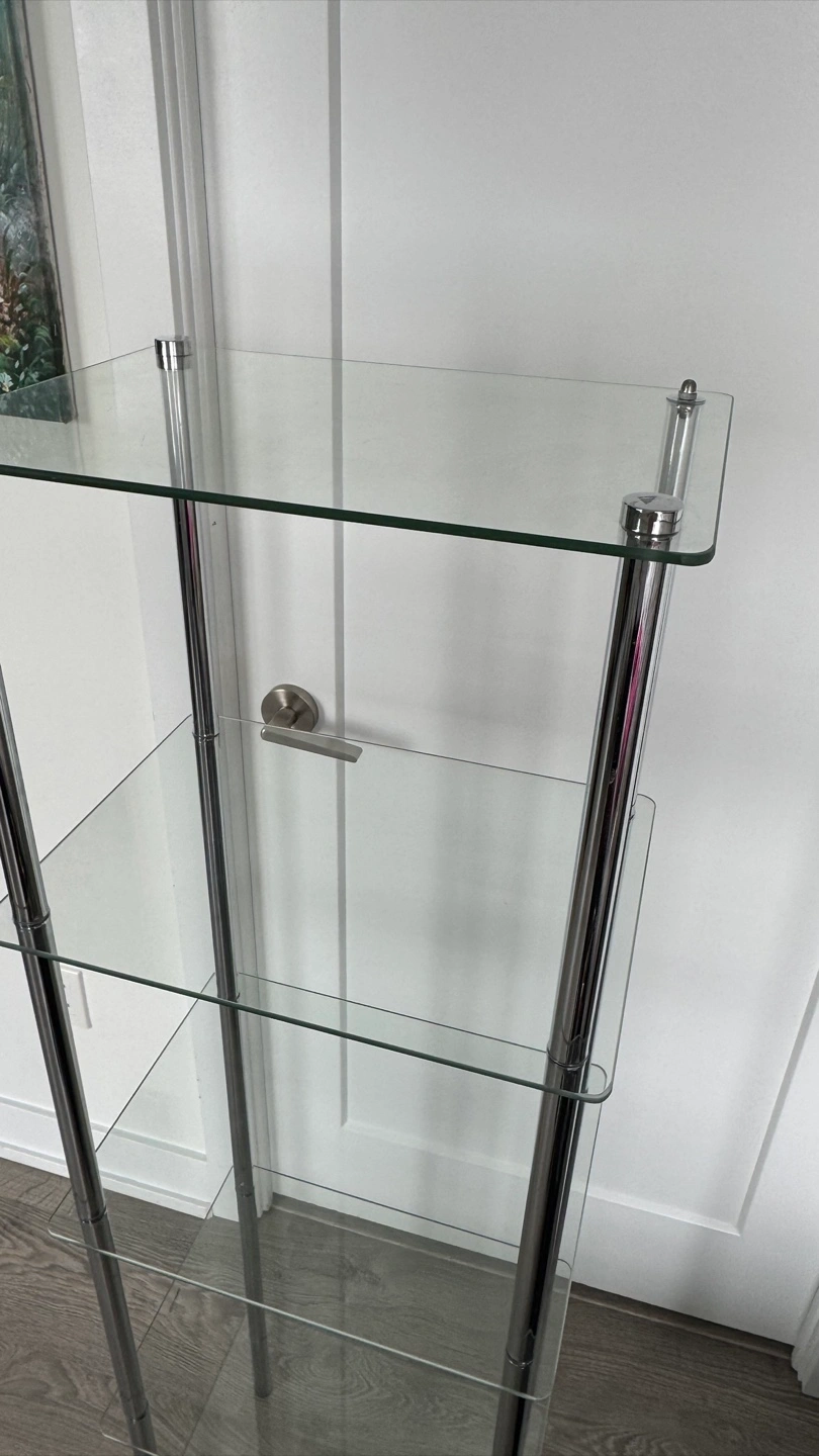 This stylish glass shelf unit features a sleek chrome frame. It's perfect for displaying your favourite items or adding a touch of modern elegance to any room. The shelves are made of clear glass, allowing light to pass through and creating a bright and airy feel. It measures about 140 cm in height.