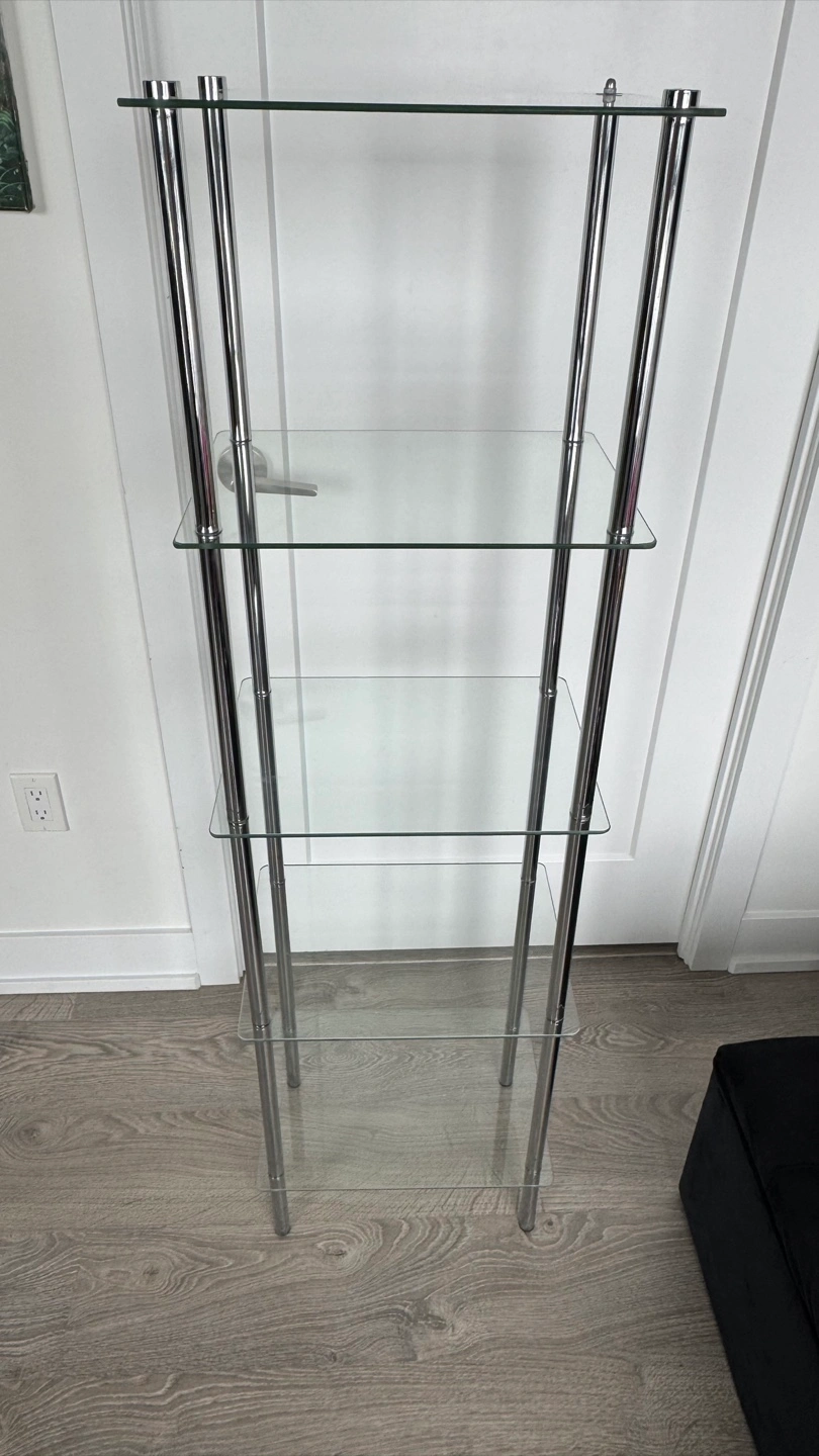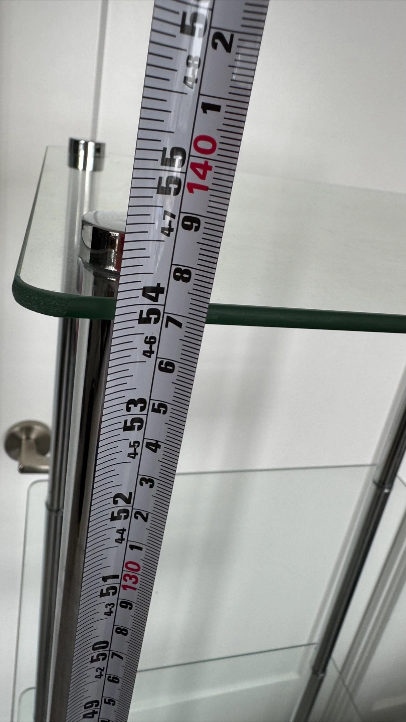 This stylish glass shelf unit features a sleek chrome frame. It's perfect for displaying your favourite items or adding a touch of modern elegance to any room. The shelves are made of clear glass, allowing light to pass through and creating a bright and airy feel. It measures about 140 cm in height.